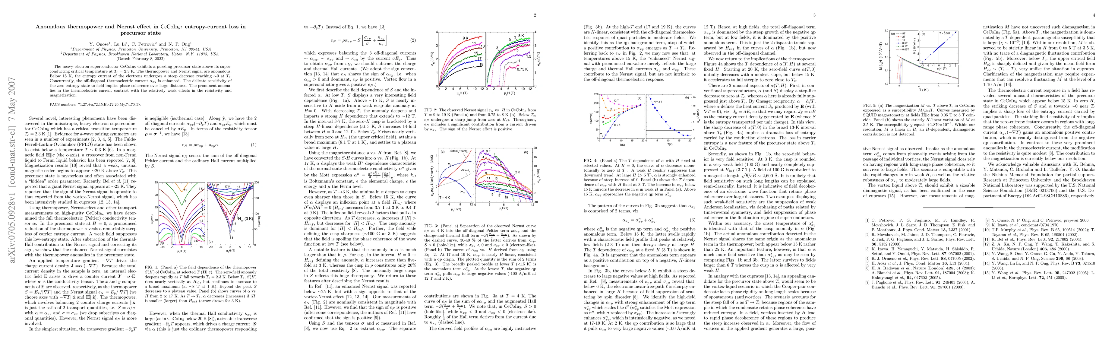 The paper investigates the unusual thermopower and Nernst effect in the heavy-electron superconductor CeCoIn$_5$, revealing a precursor state above its critical temperature with significant entropy loss and enhanced off-diagonal thermoelectric current, indicating phase coherence over large distances. The anomalies in thermoelectric properties contrast with relatively minor resistivity and magnetization changes.