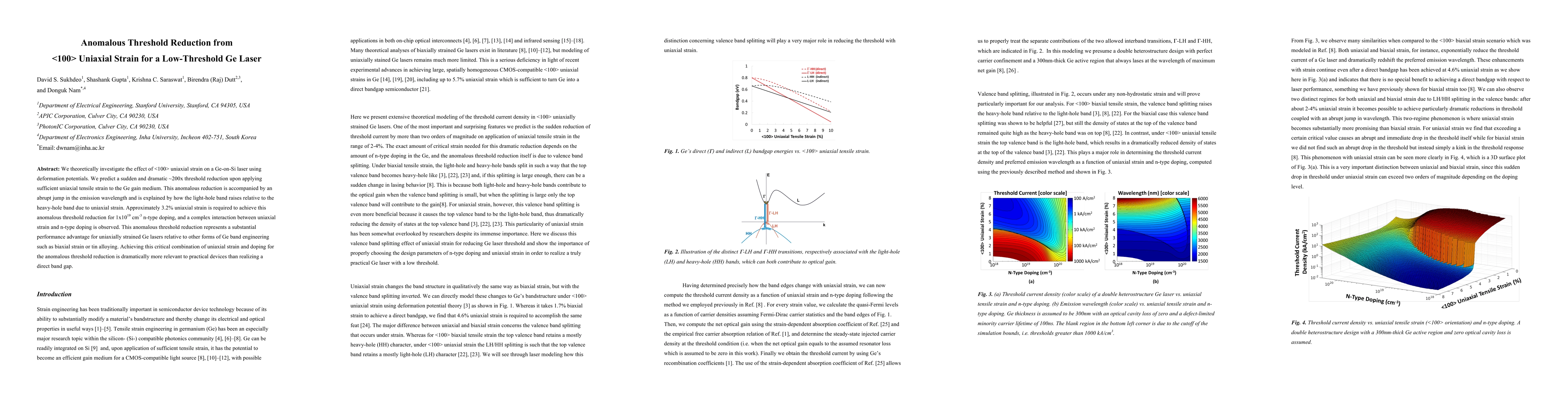 Uniaxial strain reduces Ge laser threshold by ~200x at 3.2% strain, offering a substantial performance advantage over other band engineering methods.