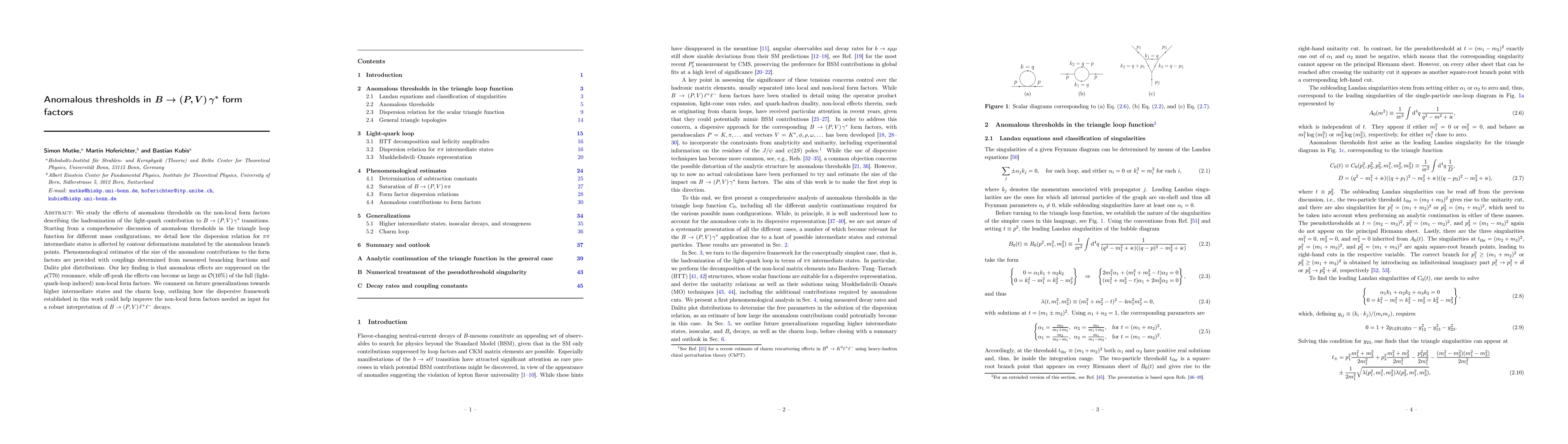 We study the effects of anomalous thresholds on the non-local form factors describing the hadronization of the light-quark contribution to $B\to(P,V)\gamma^*$ transitions. Starting from a comprehensive discussion of anomalous thresholds in the triangle loop function for different mass configurations, we detail how the dispersion relation for $\pi\pi$ intermediate states is affected by contour deformations mandated by the anomalous branch points. Phenomenological estimates of the size of the anomalous contributions to the form factors are provided with couplings determined from measured branching fractions and Dalitz plot distributions. Our key finding is that anomalous effects are suppressed on the $\rho(770)$ resonance, while off-peak the effects can become as large as $\mathcal{O}(10\%)$ of the full (light-quark-loop induced) non-local form factors. We comment on future generalizations towards higher intermediate states and the charm loop, outlining how the dispersive framework established in this work could help improve the non-local form factors needed as input for a robust interpretation of $B\to (P,V)\ell^+\ell^-$ decays.