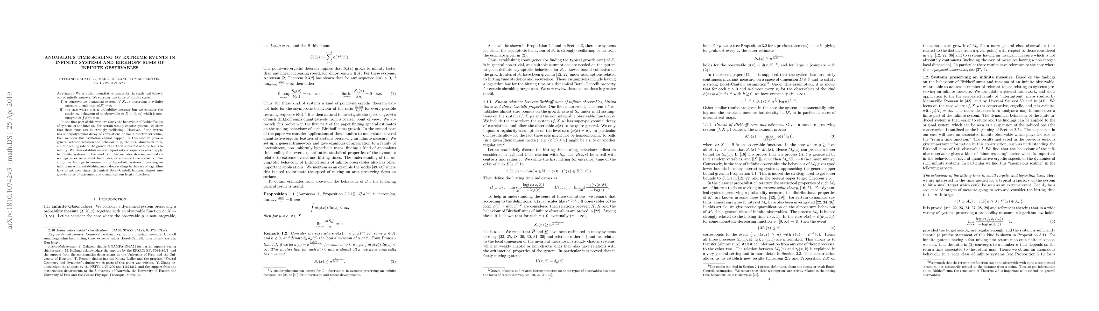 This paper investigates the statistical behavior of infinite systems, focusing on the anomalous time-scaling of extreme events and the behavior of Birkhoff sums for non-integrable observables. It demonstrates strong oscillations in Birkhoff sums for weakly chaotic systems but proves asymptotic relations for systems with superpolynomial decay of correlations or Markov structures, leading to significant consequences for infinite systems, including anomalous scalings in extreme event statistics and entrance time laws.