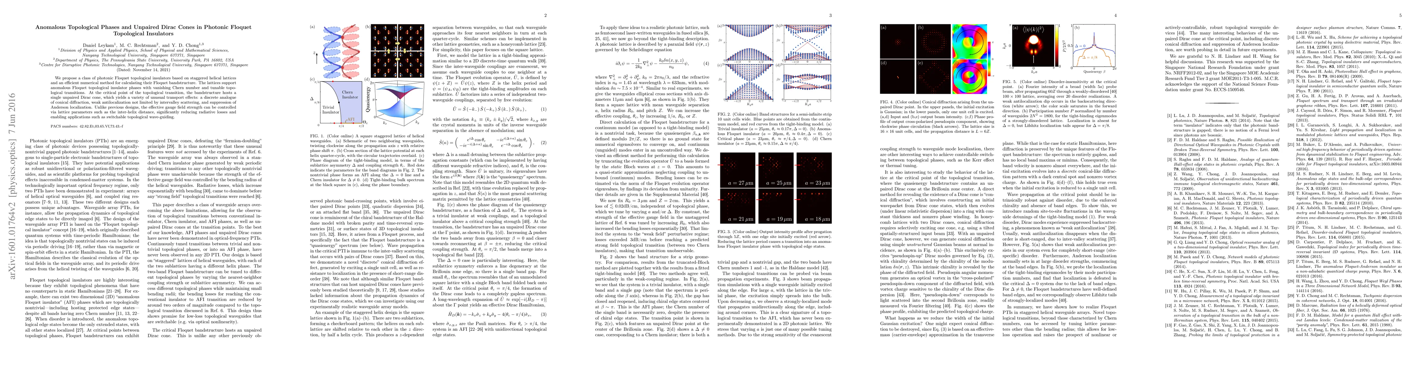 We propose a class of photonic Floquet topological insulators based on staggered helical lattices and an efficient numerical method for calculating their Floquet bandstructure. The lattices support anomalous Floquet topological insulator phases with vanishing Chern number and tunable topological transitions. At the critical point of the topological transition, the bandstructure hosts a single unpaired Dirac cone, which yields a variety of unusual transport effects: a discrete analogue of conical diffraction, weak antilocalization not limited by intervalley scattering, and suppression of Anderson localization. Unlike previous designs, the effective gauge field strength can be controlled via lattice parameters such as the inter-helix distance, significantly reducing radiative losses and enabling applications such as switchable topological wave-guiding.