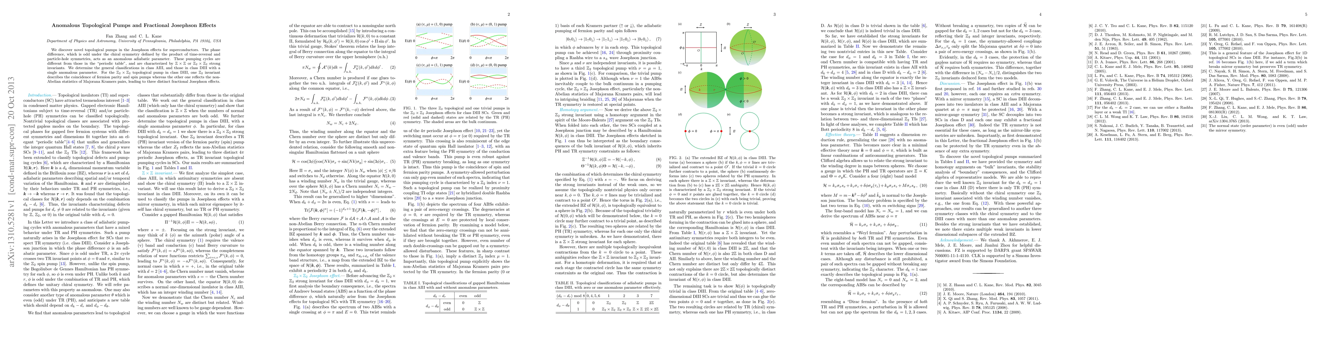 We discover novel topological pumps in the Josephson effects for superconductors. The phase difference, which is odd under the chiral symmetry defined by the product of time-reversal and particle-hole symmetries, acts as an anomalous adiabatic parameter. These pumping cycles are different from those in the "periodic table", and are characterized by $Z\times Z$ or $Z_2\times Z_2$ strong invariants. We determine the general classifications in class AIII, and those in class DIII with a single anomalous parameter. For the $Z_2\times Z_2$ topological pump in class DIII, one $Z_2$ invariant describes the coincidence of fermion parity and spin pumps whereas the other one reflects the non-Abelian statistics of Majorana Kramers pairs, leading to three distinct fractional Josephson effects.
