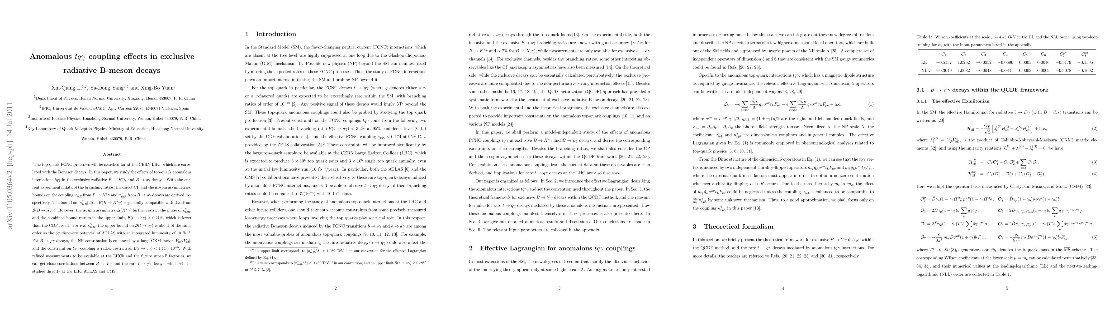 The top-quark FCNC processes will be searched for at the CERN LHC, which are correlated with the B-meson decays. In this paper, we study the effects of top-quark anomalous interactions $tq\gamma$ in the exclusive radiative $B\to K^*\gamma$ and $B\to\rho\gamma$ decays. With the current experimental data of the branching ratios, the direct CP and the isospin asymmetries, bounds on the coupling $\kappa_{tcR}^{\gamma}$ from $B\to K^*\gamma$ and $\kappa_{tuR}^{\gamma}$ from $B\to \rho\gamma$ decays are derived, respectively. The bound on $|\kappa_{tcR}^{\gamma}|$ from ${\mathcal B}(B\to K^{*}\gamma)$ is generally compatible with that from ${\mathcal B}(B\to X_{s}\gamma)$. However, the isospin asymmetry $\Delta(K^{*}\gamma)$ further restrict the phase of $\kappa_{tcR}^{\gamma}$, and the combined bound results in the upper limit, $\mathcal B(t\to c\gamma)<0.21%$, which is lower than the CDF result. For real $\kappa_{tcR}^{\gamma}$, the upper bound on $\mathcal B(t\to c\gamma)$ is about of the same order as the $5\sigma$ discovery potential of ATLAS with an integrated luminosity of $10 {\rm fb}^{-1}$. For $B\to\rho\gamma$ decays, the NP contribution is enhanced by a large CKM factor $|V_{ud}/V_{td}|$, and the constraint on $tu\gamma$ coupling is rather restrictive, $\mathcal B(t\to u\gamma)<1.44\times 10^{-5}$. With refined measurements to be available at the LHCb and the future super-B factories, we can get close correlations between $B\to V \gamma$ and the rare $t\to q\gamma$ decays, which will be studied directly at the LHC ATLAS and CMS.