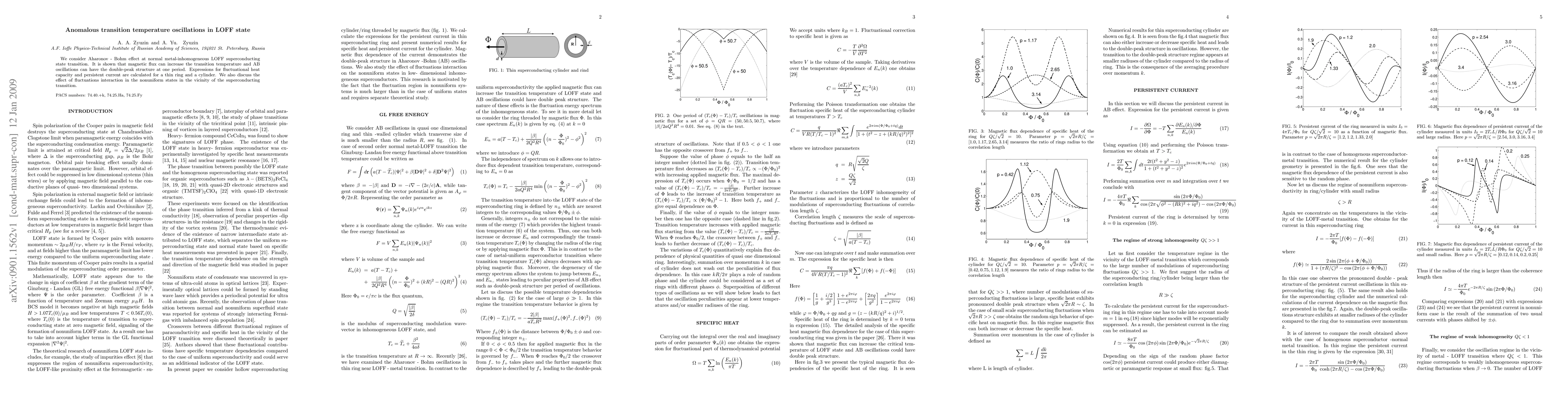 We consider Aharonov - Bohm effect at normal metal-inhomogeneous LOFF superconducting state transition. It is shown that magnetic flux can increase the transition temperature and AB oscillations can have the double-peak structure at one period. Expressions for fuctuational heat capacity and persistent current are calculated for a thin ring and a cylinder. We also discuss the effect of fluctuations interaction in the nonuniform states in the vicinity of the superconducting transition.