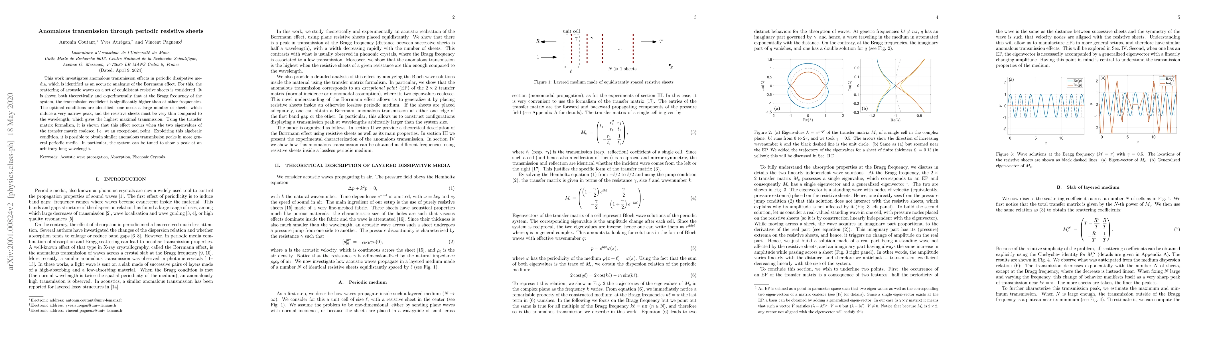 This paper explores anomalous transmission in periodic resistive sheets, revealing significantly higher transmission at the Bragg frequency akin to the Borrmann effect. Theoretical and experimental results show that optimal transmission occurs with many thin sheets, and the effect is explained by the coalescence of transfer matrix eigenvalues at an exceptional point.