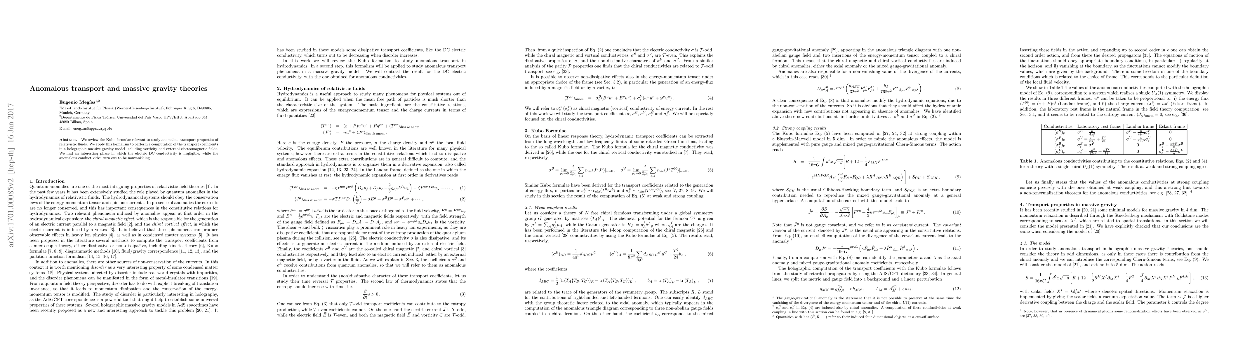 This paper reviews Kubo formulae for studying anomalous transport in relativistic fluids and applies this to a holographic massive gravity model, revealing a phase with negligible electric DC conductivity but nonvanishing anomalous conductivities.