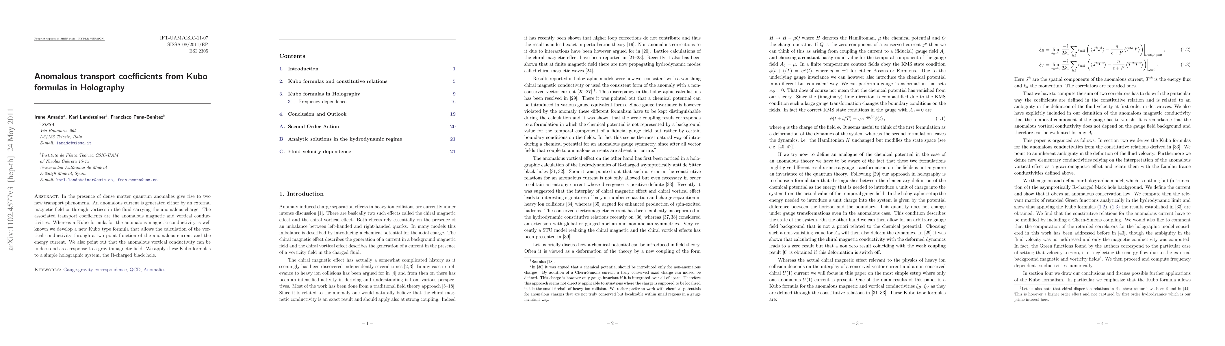 In the presence of dense matter quantum anomalies give rise to two new transport phenomena. An anomalous current is generated either by an external magnetic field or through vortices in the fluid carrying the anomalous charge. The associated transport coefficients are the anomalous magnetic and vortical conductivities. Whereas a Kubo formula for the anomalous magnetic conductivity is well known we develop a new Kubo type formula that allows the calculation of the vortical conductivity through a two point function of the anomalous current and the momentum density. We also point out that the anomalous vortical conductivity can be understood as a response to a gravitomagnetic field. We apply these Kubo formulas to a simple Holographic system, the R-charged black hole.