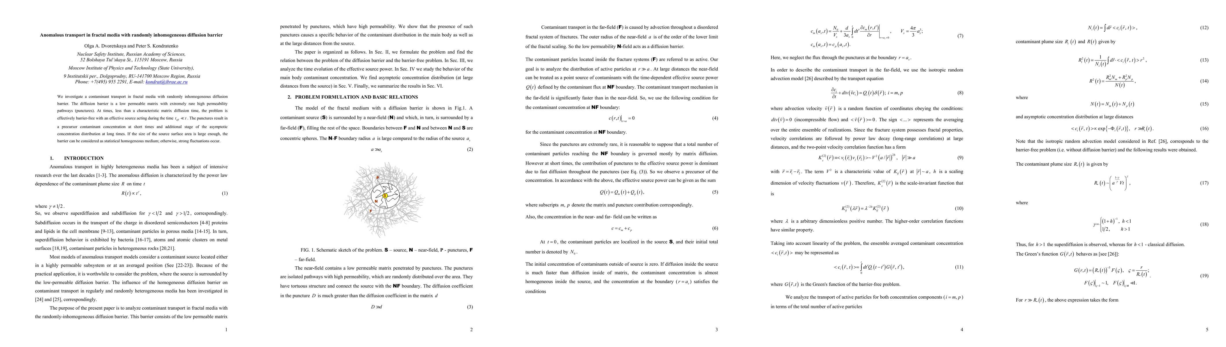 This paper explores contaminant transport in fractal media with randomly inhomogeneous diffusion barriers, revealing that rare high permeability pathways create precursor concentrations at short times and additional asymptotic stages at long times. The barrier's effect depends on the source surface area, leading to either statistical homogeneity or strong fluctuations.