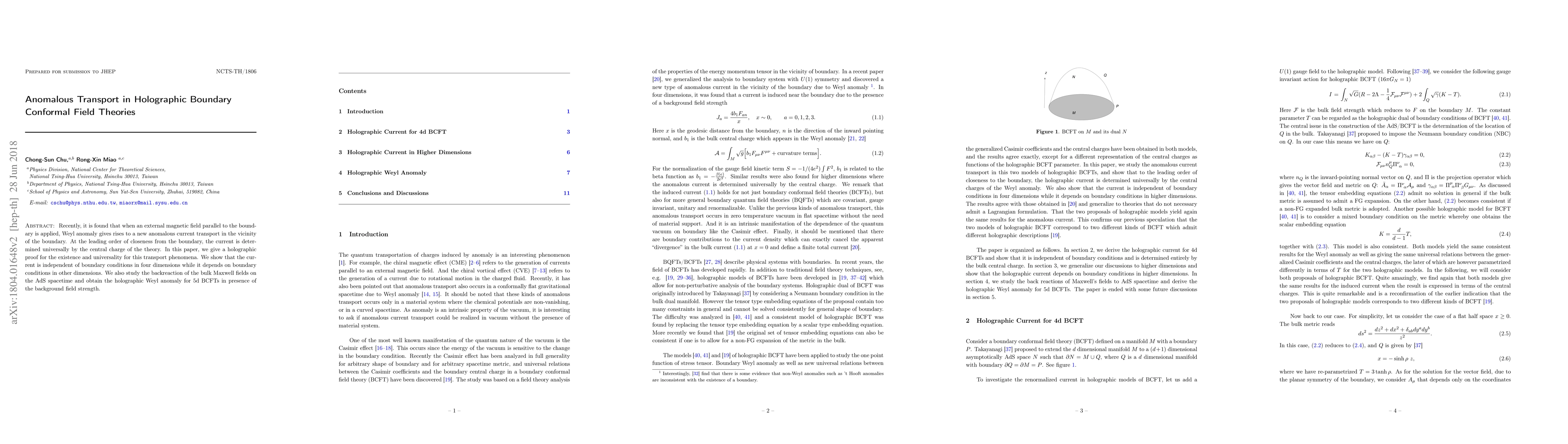 This paper provides a holographic proof for anomalous current transport in boundary conformal field theories under an external magnetic field, demonstrating universality determined by the central charge. It shows that the current is independent of boundary conditions in four dimensions but depends on them in other dimensions, and studies the backreaction of bulk fields on AdS spacetime.