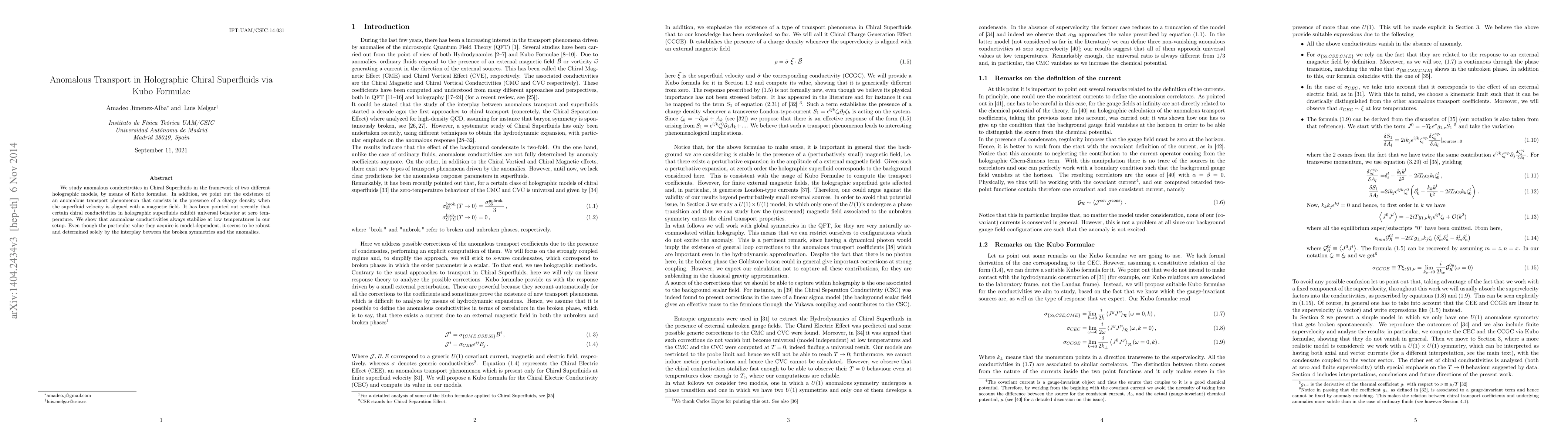 We study anomalous conductivities in Chiral Superfluids in the framework of two different holographic models, by means of Kubo formulae. In addition, we point out the existence of an anomalous transport phenomenon that consists in the presence of a charge density when the superfluid velocity is aligned with a magnetic field. It has been pointed out recently that certain chiral conductivities in holographic superfluids exhibit universal behavior at zero temperature. We show that anomalous conductivities always stabilize at low temperatures in our setup. Even though the particular value they acquire is model-dependent, it seems to be robust and determined solely by the interplay between the broken symmetries and the anomalies.