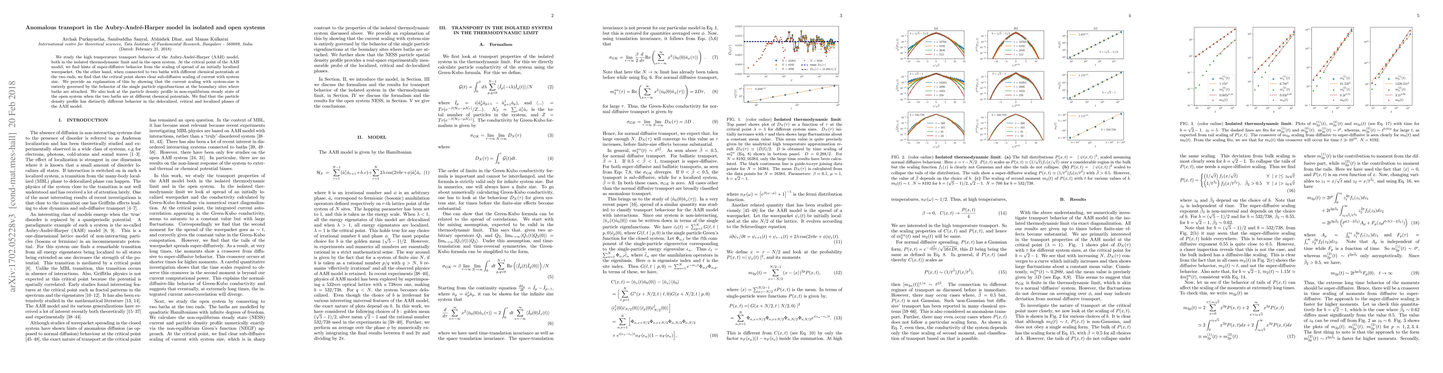 The Aubry-André-Harper model's transport behavior differs in isolated and open systems, with super-diffusive scaling at the critical point in isolation but sub-diffusive scaling when connected to baths with different chemical potentials.