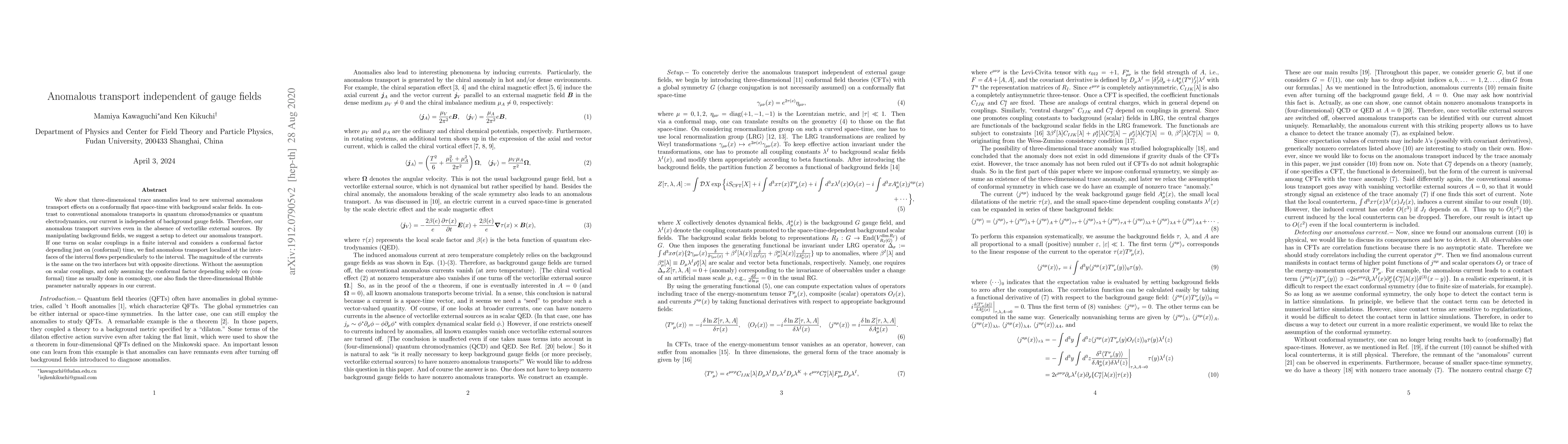 We show that three-dimensional trace anomalies lead to new universal anomalous transport effects on a conformally-flat spacetime with background scalar fields. In contrast to conventional anomalous transports in quantum chromodynamics (QCD) or quantum electrodynamics (QED), our current is independent of background gauge fields. Therefore, our anomalous transport survives even in the absence of vector-like external sources. By manipulating background fields, we suggest a setup to detect our anomalous transport. If one turns on scalar couplings in a finite interval and considers a conformal factor depending just on (conformal) time, we find anomalous transport localized at the interfaces of the interval flows perpendicularly to the interval. The magnitude of the currents is the same on the two interfaces but with opposite directions. Without the assumption on scalar couplings, and only assuming the conformal factor depending solely on (conformal) time as usually done in cosmology, one also finds the three-dimensional Hubble parameter naturally appears in our current.