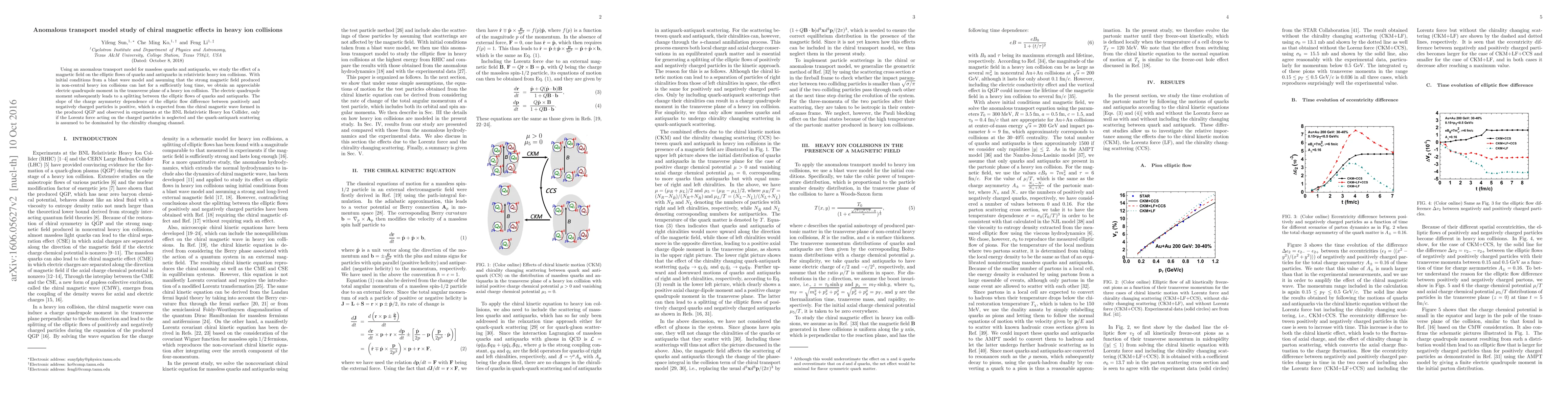 This study employs an anomalous transport model to investigate the chiral magnetic effect in heavy ion collisions, finding a magnetic field influences quark and antiquark elliptic flows, leading to a charge asymmetry. The observed positive slope of elliptic flow difference aligns with theoretical predictions if chirality-changing quark-antiquark interactions dominate.