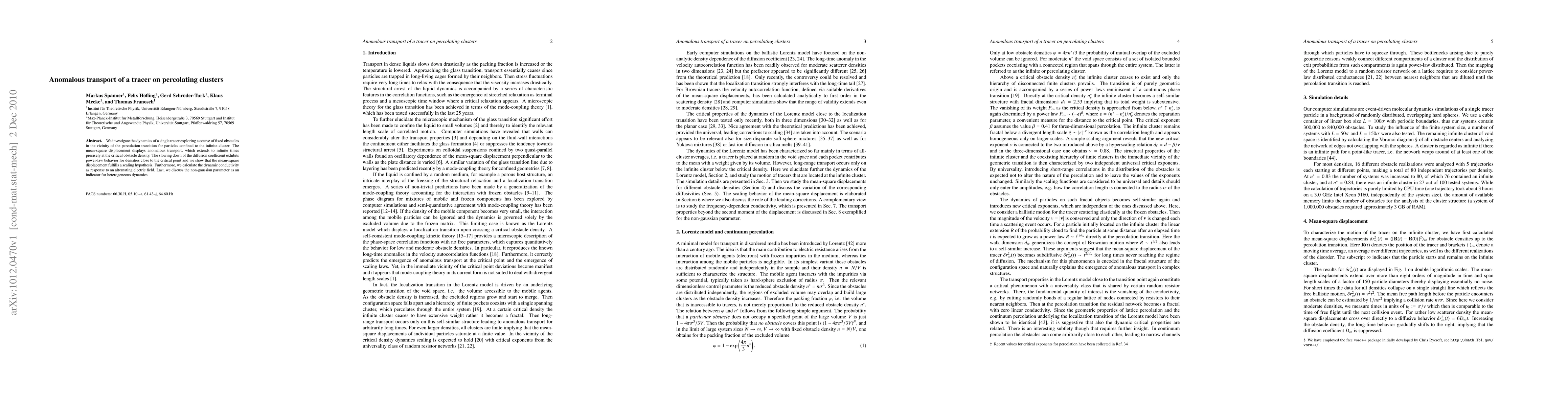 We investigate the dynamics of a single tracer exploring a course of fixed obstacles in the vicinity of the percolation transition for particles confined to the infinite cluster. The mean-square displacement displays anomalous transport, which extends to infinite times precisely at the critical obstacle density. The slowing down of the diffusion coefficient exhibits power-law behavior for densities close to the critical point and we show that the mean-square displacement fulfills a scaling hypothesis. Furthermore, we calculate the dynamic conductivity as response to an alternating electric field. Last, we discuss the non-gaussian parameter as an indicator for heterogeneous dynamics.