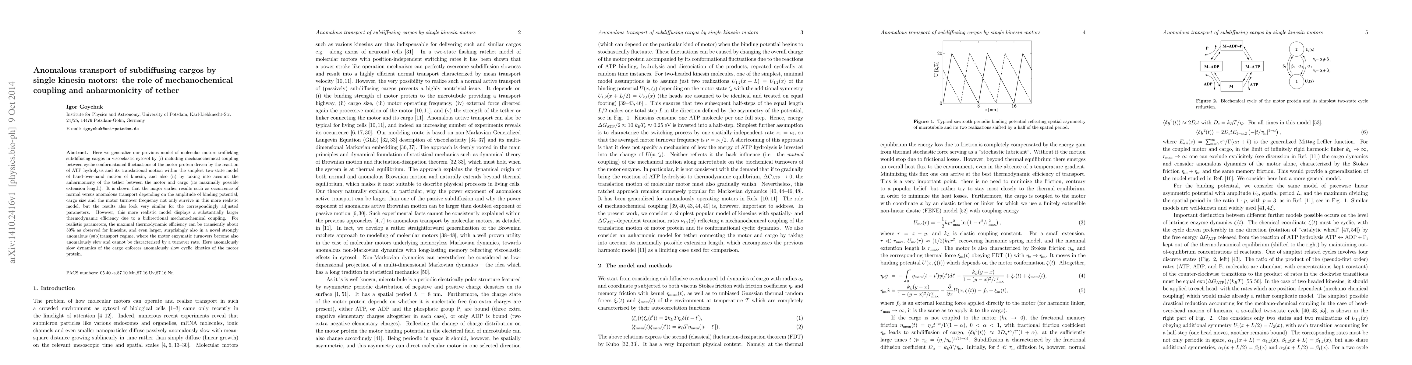 This paper generalizes a model of kinesin motors transporting subdiffusing cargos, incorporating mechanochemical coupling and anharmonic tether effects. It finds that while earlier results on transport types persist, the model shows enhanced thermodynamic efficiency due to bidirectional mechanochemical coupling, achieving up to 50% efficiency, and reveals a novel regime of strongly anomalous transport with slow motor kinetics.
