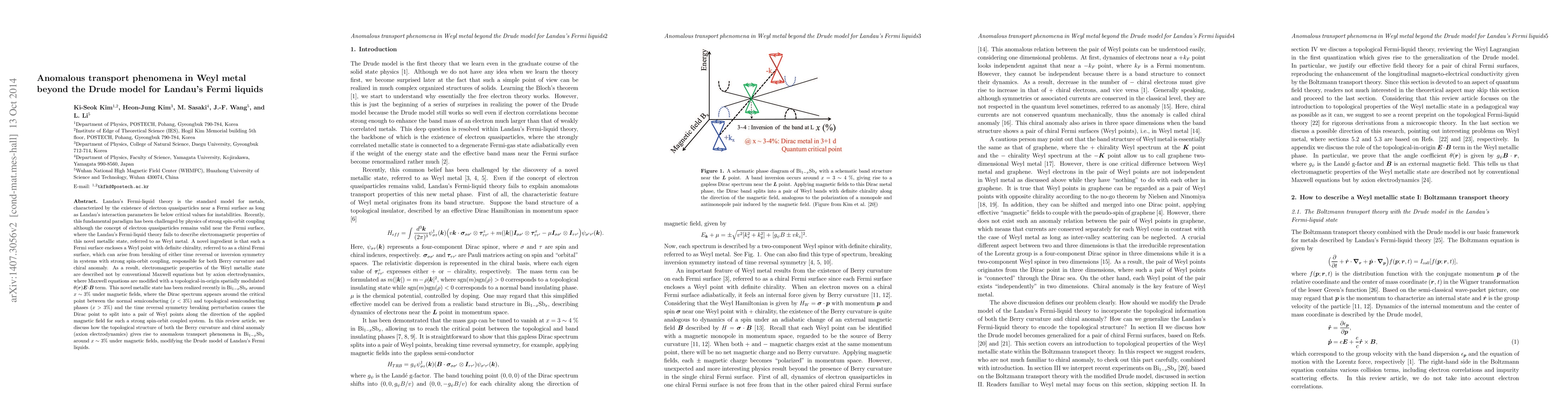 Landau's Fermi-liquid theory is the standard model for metals, characterized by the existence of electron quasiparticles near a Fermi surface as long as Landau's interaction parameters lie below critical values for instabilities. Recently, this fundamental paradigm has been challenged by physics of strong spin-orbit coupling although the concept of electron quasiparticles remains valid near the Fermi surface, where the Landau's Fermi-liquid theory fails to describe electromagnetic properties of this novel metallic state, referred to as Weyl metal. A novel ingredient is that such a Fermi surface encloses a Weyl point with definite chirality, referred to as a chiral Fermi surface, which can arise from breaking of either time reversal or inversion symmetry in systems with strong spin-orbit coupling, responsible for both Berry curvature and chiral anomaly. As a result, electromagnetic properties of the Weyl metallic state are described not by conventional Maxwell equations but by axion electrodynamics, where Maxwell equations are modified with a topological-in-origin spatially modulated $\theta(\bm{r}) \bm{E} \cdot \bm{B}$ term. This novel metallic state has been realized recently in Bi$_{1-x}$Sb$_{x}$ around $x \sim 3%$ under magnetic fields, where the Dirac spectrum appears around the critical point between the normal semiconducting ($x < 3%$) and topological semiconducting phases ($x > 3%$) and the time reversal symmetry breaking perturbation causes the Dirac point to split into a pair of Weyl points along the direction of the applied magnetic field for such a strong spin-orbit coupled system. In this review article, we discuss how the topological structure of both the Berry curvature and chiral anomaly (axion electrodynamics) gives rise to anomalous transport phenomena in Bi$_{1-x}$Sb$_{x}$ around $x \sim 3%$ under magnetic fields, modifying the Drude model of Landau's Fermi liquids.