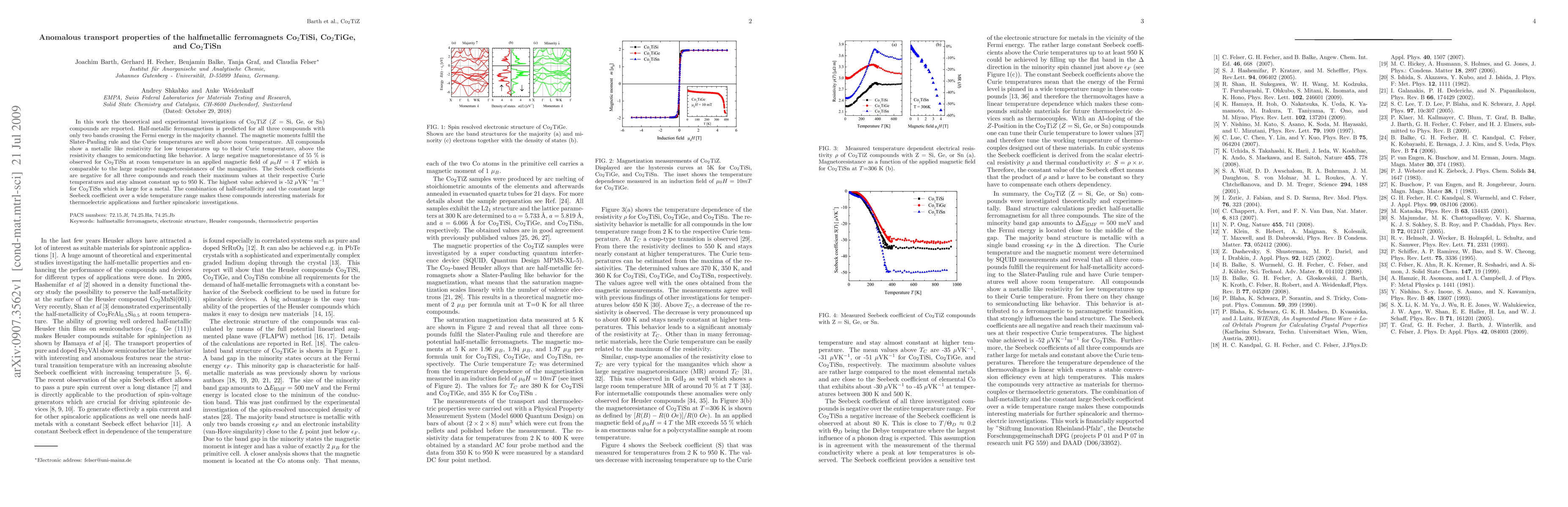 In this work the theoretical and experimental investigations of Co2TiZ (Z = Si, Ge, or Sn) compounds are reported. Half-metallic ferromagnetism is predicted for all three compounds with only two bands crossing the Fermi energy in the majority channel. The magnetic moments fulfill the Slater-Pauling rule and the Curie temperatures are well above room temperature. All compounds show a metallic like resistivity for low temperatures up to their Curie temperature, above the resistivity changes to semiconducting like behavior. A large negative magnetoresistance of 55% is observed for Co2TiSn at room temperature in an applied magnetic field of 4T which is comparable to the large negative magnetoresistances of the manganites. The Seebeck coefficients are negative for all three compounds and reach their maximum values at their respective Curie temperatures and stay almost constant up to 950 K. The highest value achieved is -52muV/K m for Co2TiSn which is large for a metal. The combination of half-metallicity and the constant large Seebeck coefficient over a wide temperature range makes these compounds interesting materials for thermoelectric applications and further spincaloric investigations.