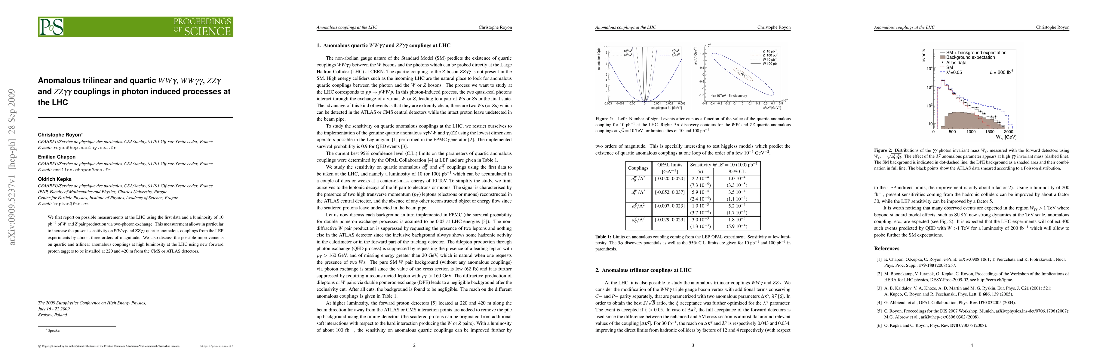 We first report on possible measurements at the LHC using the first data and a luminosity of 10 pb$^{-1}$ of $W$ and $Z$ pair production via two-photon exchange. This measurement allows in particular to increase the present sensitivity on $WW\gamma \gamma$ and $ZZ\gamma \gamma$ quartic anomalous couplings from the LEP experiments by almost three orders of magnitude. We also discuss the possible improvements on quartic and trilinear anomalous couplings at high luminosity at the LHC using new forward proton taggers to be installed at 220 and 420 m from the CMS or ATLAS detectors.