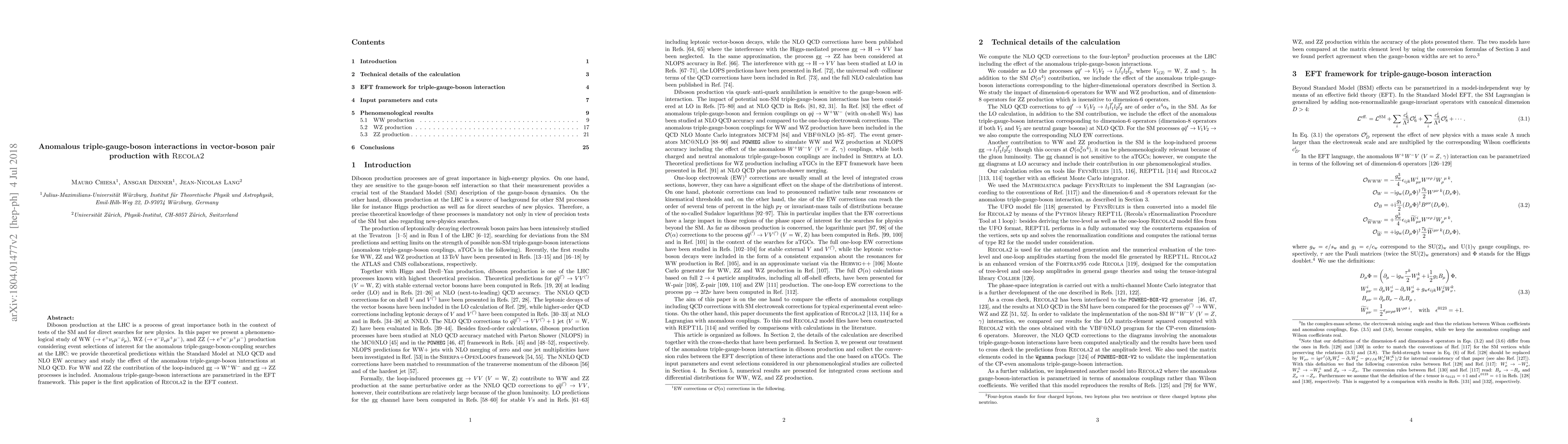 This paper investigates WW, WZ, and ZZ production at the LHC, focusing on anomalous triple-gauge-boson interactions within the Standard Model and beyond. It uses RECOLA2 for the first time in the effective field theory context to provide theoretical predictions at NLO QCD and NLO EW accuracy.