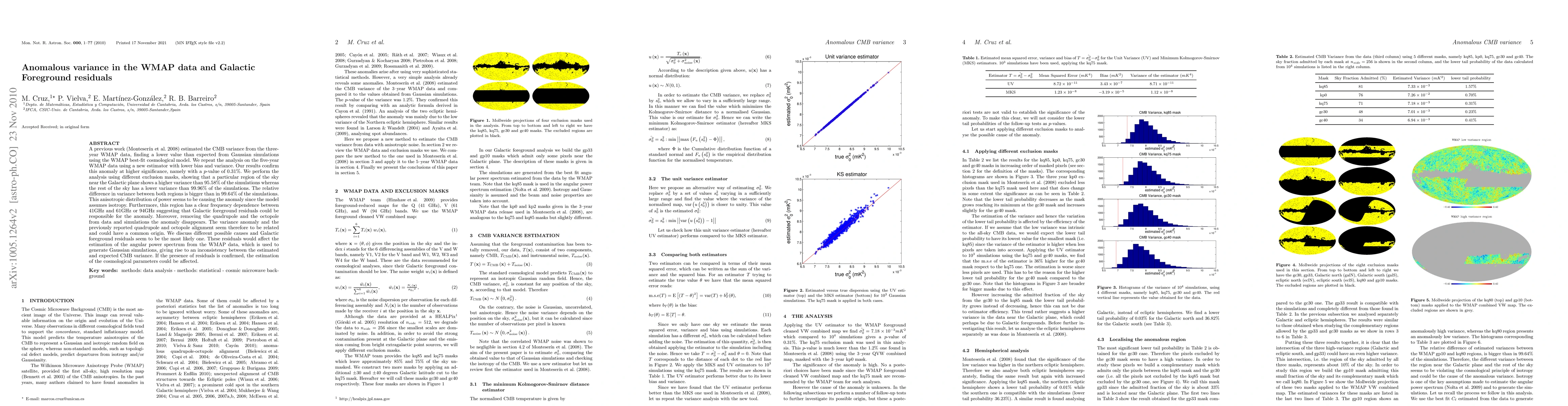 The five-year WMAP data analysis confirms a lower CMB variance than expected, with a p-value of 0.31%, suggesting an anomaly. A specific region near the Galactic plane exhibits higher variance, likely due to Galactic foreground residuals, which could affect the estimation of cosmological parameters.
