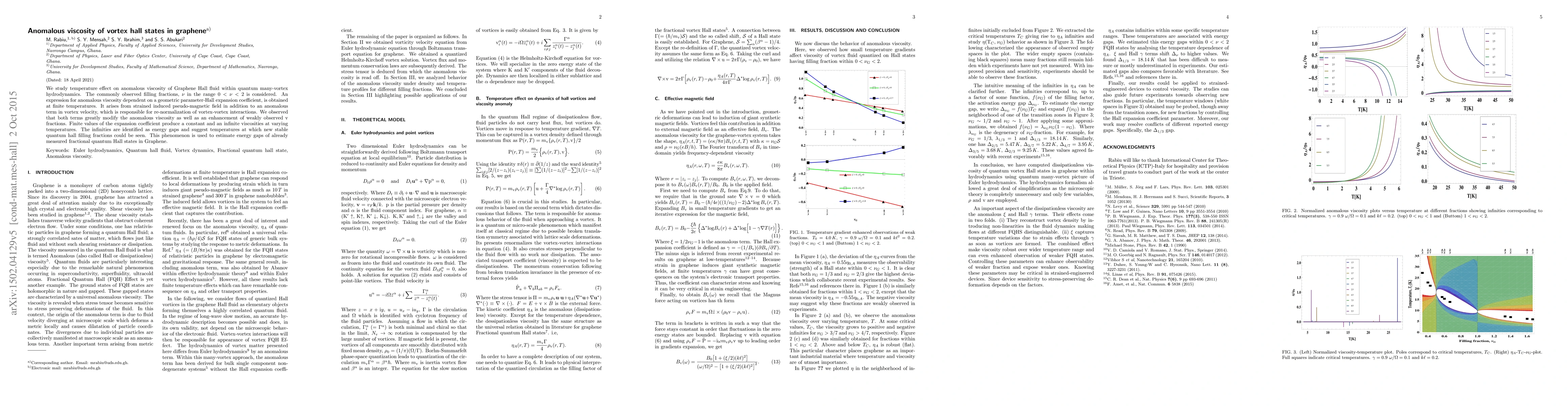 We study temperature effect on anomalous viscosity of Graphene Hall fluid within quantum many-vortex hydrodynamics. The commonly observed filling fractions, $\nu$ in the range $0 < \nu < 2$ is considered. An expression for anomalous viscosity dependent on a geometric parameter-Hall expansion coefficient, is obtained at finite temperatures. It arises from strained induced pseudo-magnetic field in addition to an anomalous term in vortex velocity, which is responsible for re-normalization of vortex-vortex interactions. We observed that both terms greatly modify the anomalous viscosity as well as an enhancement of weakly observed v fractions. Finite values of the expansion coefficient produce a constant and an infinite viscosity at varying temperatures. The infinities are identified as energy gaps and suggest temperatures at which new stable quantum hall filling fractions could be seen. This phenomenon is used to estimate energy gaps of already measured fractional quantum Hall states in Graphene.