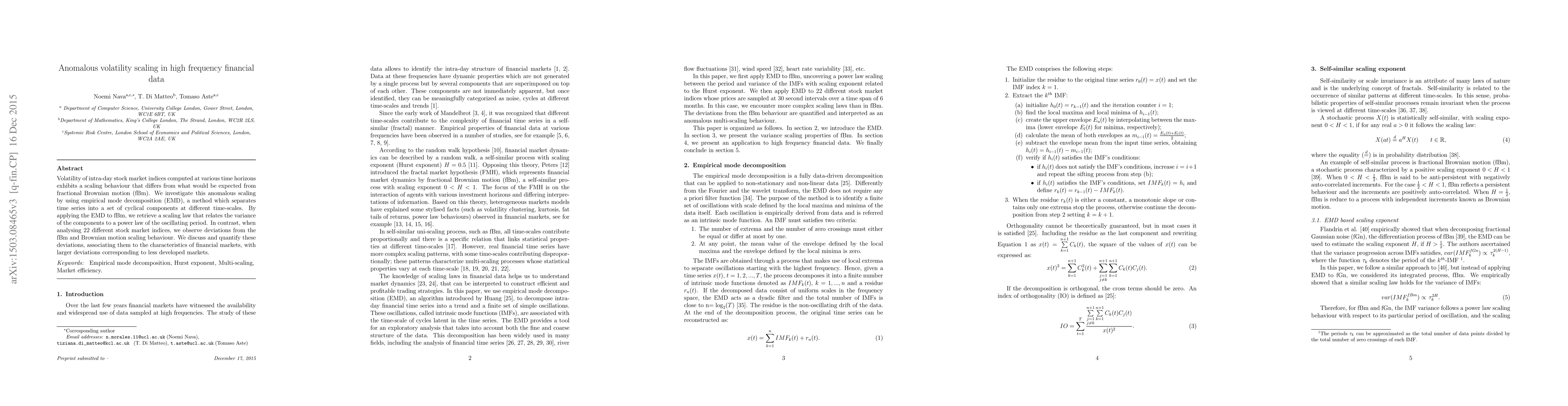 This paper investigates the anomalous volatility scaling in high-frequency stock market data, finding that intra-day indices deviate from the expected scaling laws of fractional Brownian motion. Using empirical mode decomposition, the authors identify scaling laws that differ from theoretical models, with larger deviations observed in less developed markets.