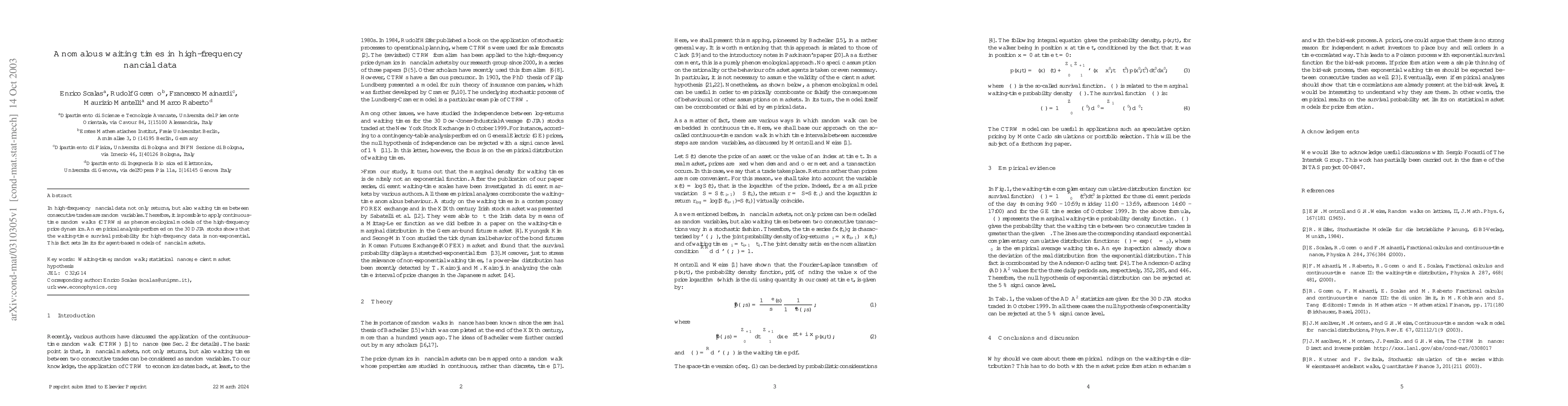 Summary: The study investigates the random nature of waiting times between trades in high-frequency financial data, applying continuous-time random walks models. Empirical analysis of 30 DJIA stocks reveals non-exponential waiting-time survival probabilities, challenging traditional agent-based financial market models.
