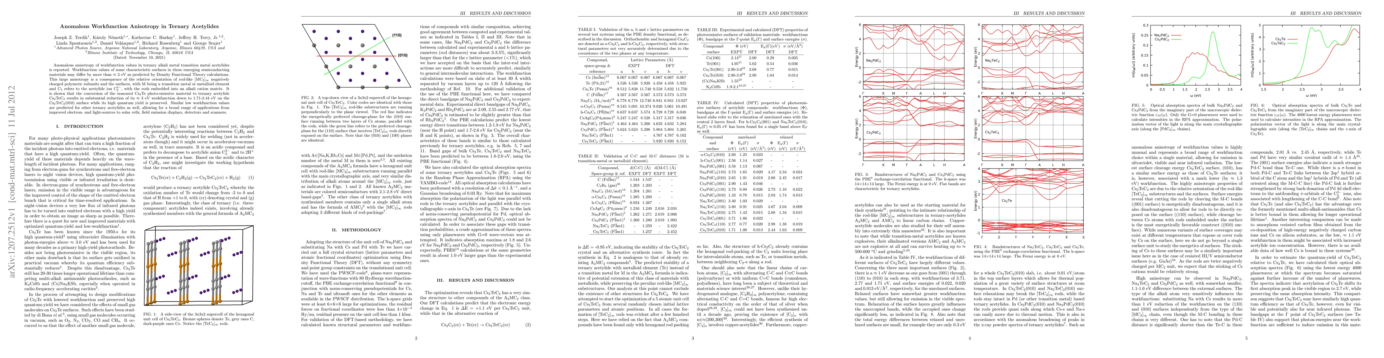 Anomalous anisotropy of workfunction values in ternary alkali metal transition metal acetylides is reported. Workfunction values of some characteristic surfaces in these emerging semiconducting materials may differ by more than $\approx$ 2 eV as predicted by Density Functional Theory calculations. This large anisotropy is a consequence of the relative orientation of rod-like [MC$_{2}$]$_{\infty}$ negatively charged polymeric subunits and the surfaces, with M being a transition metal or metalloid element and C$_{2}$ refers to the acetylide ion C$_{2}^{2-}$, with the rods embedded into an alkali cation matrix. It is shown that the conversion of the seasoned Cs$_{2}$Te photo-emissive material to ternary acetylide Cs$_{2}$TeC$_{2}$ results in substantial reduction of its $\approx$ 3 eV workfunction down to 1.71-2.44 eV on the Cs$_{2}$TeC$_{2}$(010) surface while its high quantum yield is preserved. Similar low workfunction values are predicted for other ternary acetylides as well, allowing for a broad range of applications from improved electron- and light-sources to solar cells, field emission displays, detectors and scanners.