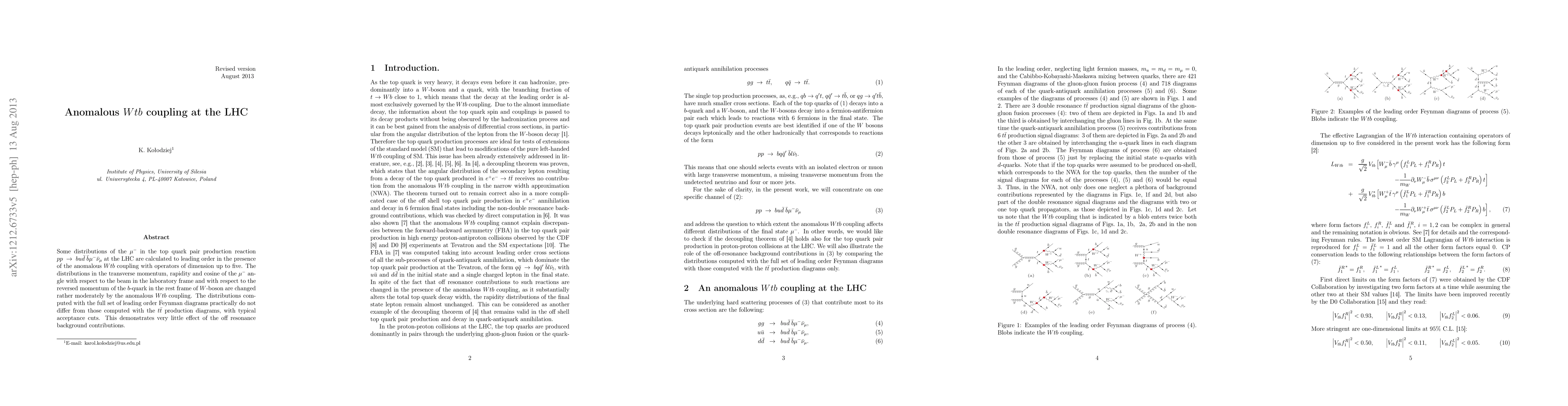Some distributions of the mu- in the top quark pair production reaction pp -> b u anti-d anti-b mu- anti-nu_mu at the LHC are calculated to leading order in the presence of the anomalous Wtb coupling with operators of dimension up to five. The distributions in the transverse momentum, rapidity and cosine of the mu- angle with respect to the beam in the laboratory frame and with respect to the reversed momentum of the b-quark in the rest frame of W-boson are changed rather moderately by the anomalous Wtb coupling. The distributions computed with the full set of leading order Feynman diagrams practically do not differ from those computed with the t anti-t production diagrams, with typical acceptance cuts. This demonstrates very little effect of the off resonance background contributions.
