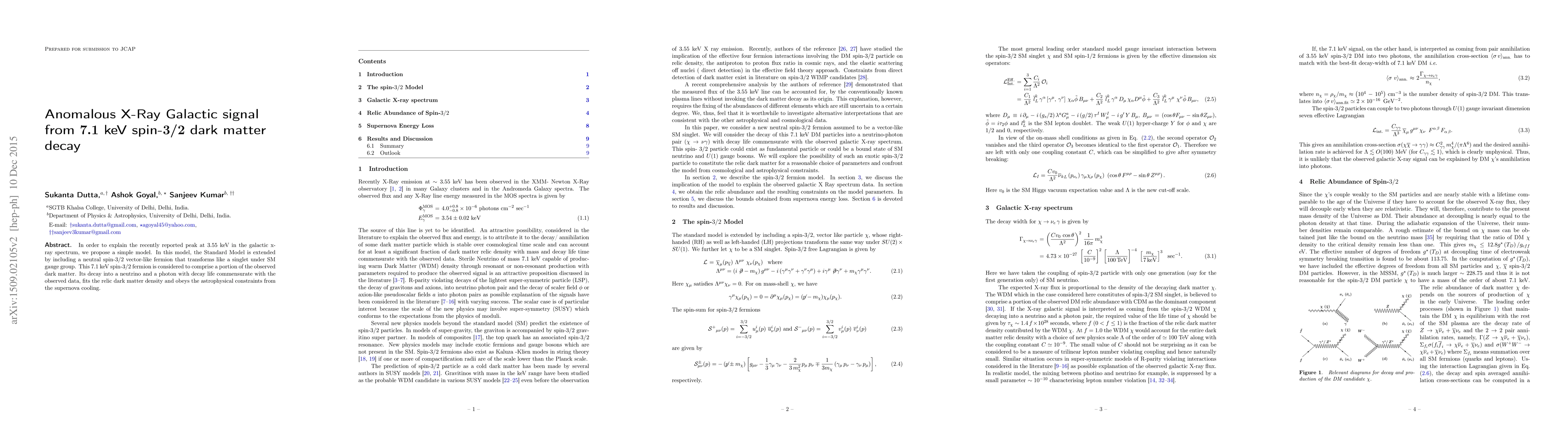 In order to explain the recently reported peak at $3.55$ keV in the galactic x-ray spectrum, we propose a simple model. In this model, the Standard Model is extended by including a neutral spin-$3/2$ vector-like fermion that transforms like a singlet under SM gauge group. This $7.1$ keV spin-$3/2$ fermion is considered to comprise a portion of the observed dark matter. Its decay into a neutrino and a photon with decay life commensurate with the observed data, fits the relic dark matter density and obeys the astrophysical constraints from the supernova cooling.