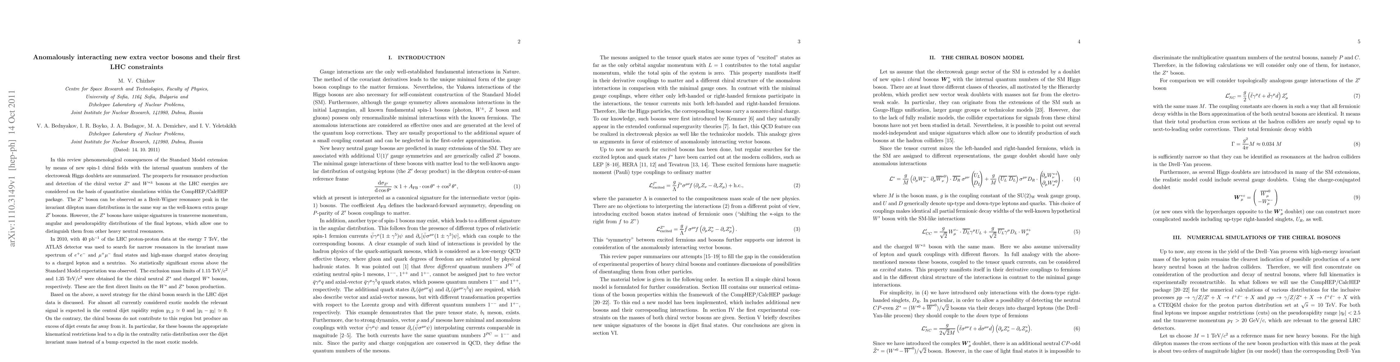 In this review phenomenological consequences of the Standard Model extension by means of new spin-1 chiral fields with the internal quantum numbers of the electroweak Higgs doublets are summarized. The prospects for resonance production and detection of the chiral vector $Z^*$ and $W^{*\pm}$ bosons at the LHC energies are considered. The $Z^*$ boson can be observed as a Breit-Wigner resonance peak in the invariant dilepton mass distributions in the same way as the well-known extra gauge $Z'$ bosons. However, the $Z^*$ bosons have unique signatures in transverse momentum, angular and pseudorapidity distributions of the final leptons, which allow one to distinguish them from other heavy neutral resonances. In 2010, with 40 pb$^{-1}$ of the LHC proton-proton data at the energy 7 TeV, the ATLAS detector was used to search for narrow resonances in the invariant mass spectrum of $e^+e^-$ and $\mu^+\mu^-$ final states and high-mass charged states decaying to a charged lepton and a neutrino. No statistically significant excess above the Standard Model expectation was observed. The exclusion mass limits of 1.15 TeV$/c^2$ and 1.35 TeV$/c^2$ were obtained for the chiral neutral $Z^*$ and charged $W^*$ bosons, respectively. These are the first direct limits on the $W^*$ and $Z^*$ boson production. For almost all currently considered exotic models the relevant signal is expected in the central dijet rapidity region. On the contrary, the chiral bosons do not contribute to this region but produce an excess of dijet events far away from it. For these bosons the appropriate kinematic restrictions lead to a dip in the centrality ratio distribution over the dijet invariant mass instead of a bump expected in the most exotic models.