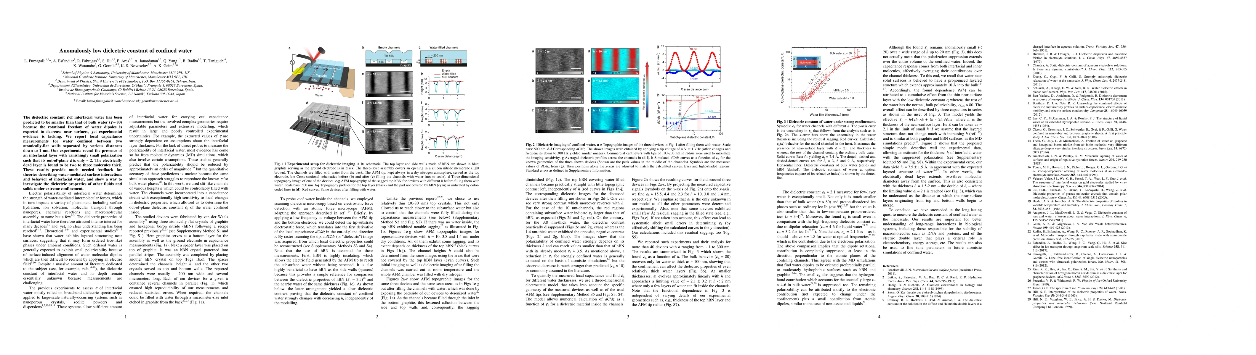 This study reports local capacitance measurements revealing that water confined between atomically-flat walls exhibits an anomalously low dielectric constant of approximately 2, indicating a significant reduction in polarization due to restricted rotational freedom of water dipoles. This electrically dead interfacial layer provides crucial insights into water-surface interactions and offers a method to study dielectric properties under extreme confinement.