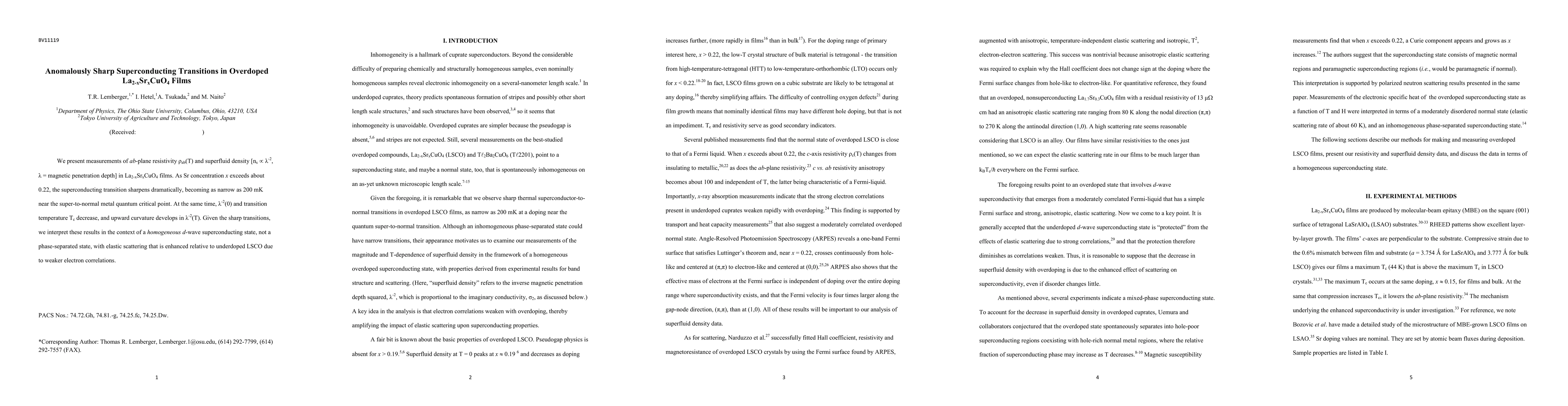 This paper reports on the sharp superconducting transitions in overdoped $La_{2-x}Sr_{x}CuO_{4}$ films, noting a dramatic narrowing of the transition as Sr concentration increases. The study suggests a homogeneous d-wave superconducting state with enhanced elastic scattering, contrasting with the inhomogeneous phase separation theory.