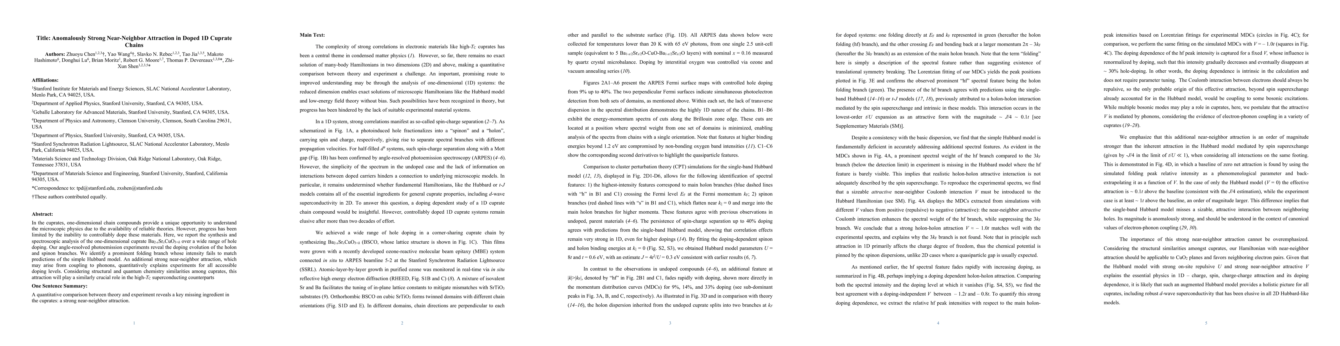 The paper presents advanced ARPES spectroscopic analysis and CPT simulations to identify and explain an anomalously strong near-neighbor attraction in doped 1D cuprate chains, which may have significant implications for understanding high-temperature superconductivity.