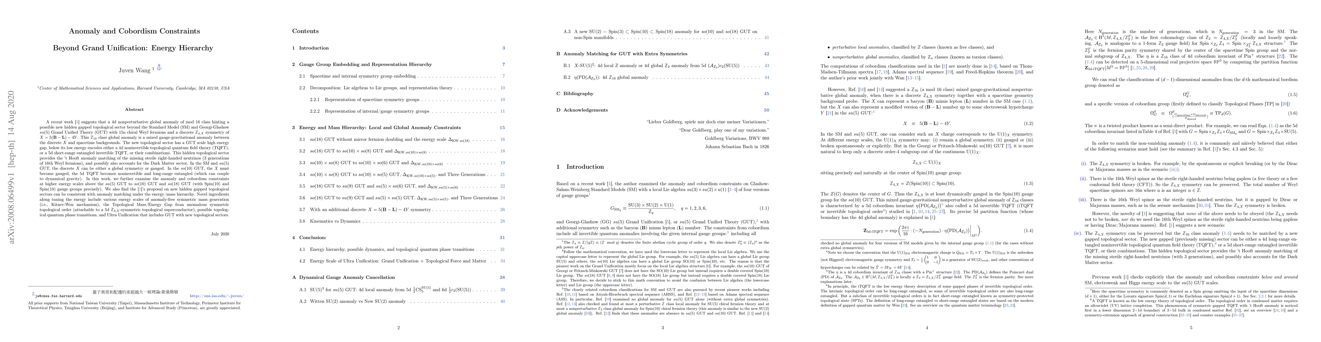A recent work [2006.16996] suggests that a 4d nonperturbative global anomaly of mod 16 class hinting a possible new hidden gapped topological sector beyond the Standard Model (SM) and Georgi-Glashow $su(5)$ Grand Unified Theory (GUT) with 15n chiral Weyl fermions and a discrete $\mathbb{Z}_{4,X}$ symmetry of $X=5({\bf B- L})-4Y$. This $\mathbb{Z}_{16}$ class global anomaly is a mixed gauge-gravitational anomaly between the discrete $X$ and spacetime backgrounds. The new topological sector has a GUT scale high energy gap, below its low energy encodes either a 4d noninvertible topological quantum field theory (TQFT), or a 5d short-range entangled invertible TQFT, or their combinations. This hidden topological sector provides the 't Hooft anomaly matching of the missing sterile right-handed neutrinos (3 generations of 16th Weyl fermions), and possibly also accounts for the Dark Matter sector. In the SM and $su(5)$ GUT, the discrete $X$ can be either a global symmetry or gauged. In the $so(10)$ GUT, the $X$ must become gauged, the 5d TQFT becomes noninvertible and long-range entangled (which can couple to dynamical gravity). In this work, we further examine the anomaly and cobordism constraints at higher energy scales above the $su(5)$ GUT to $so(10)$ GUT and $so(18)$ GUT (with Spin(10) and Spin(18) gauge groups precisely). We also find [2006.16996]'s proposal on new hidden gapped topological sectors can be consistent with anomaly matching under the energy/mass hierarchy. Novel ingredients along tuning the energy include various energy scales of anomaly-free symmetric mass generation (i.e., Kitaev-Wen mechanism), the Topological Mass/Energy Gap from anomalous symmetric topological order (attachable to a 5d $\mathbb{Z}_{4,X}$-symmetric topological superconductor), possible topological quantum phase transitions, and Ultra Unification that includes GUT with new topological sectors.