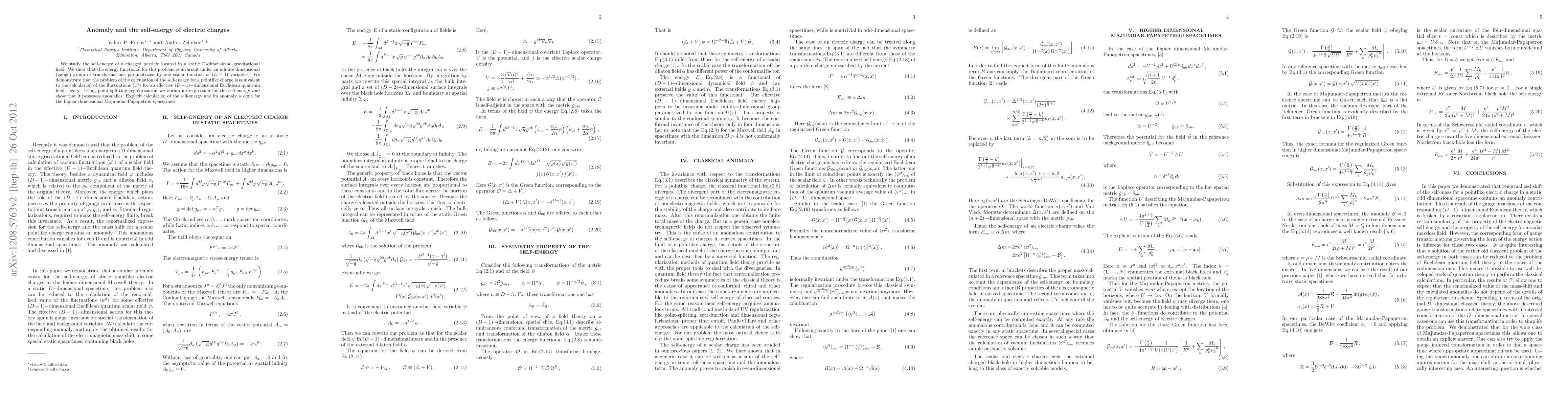 We study the self energy of a charged particle located in a static D-dimensional gravitational field. We show that the energy functional for this problem is invariant under an infinite dimensional (gauge) group of transformations parameterized by one scalar function of (D-1)-variables. We demonstrate that the problem of the calculation of the self energy for a pointlike charge is equivalent to the calculation of the fluctuations $<\psi^2>$ for an effective (D-1)-dimensional Euclidean quantum field theory. Using point-splitting regularization we obtain an expression for the self energy and show, that it possesses anomalies. Explicit calculation of the self energy and its anomaly is done for the higher dimensional Majumdar-Papapetrou spacetimes.