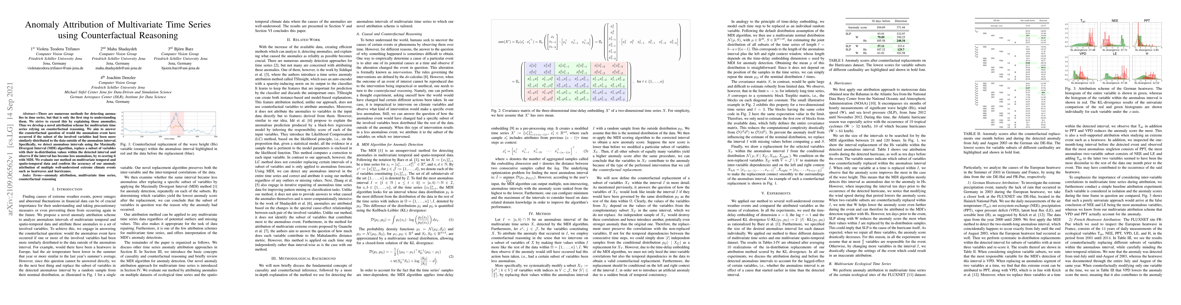 This paper introduces a novel attribution scheme for detecting and explaining anomalies in multivariate time series using counterfactual reasoning. The method replaces subsets of variables within detected anomalous intervals with in-distribution values to assess if the anomaly persists, thereby identifying contributing factors.