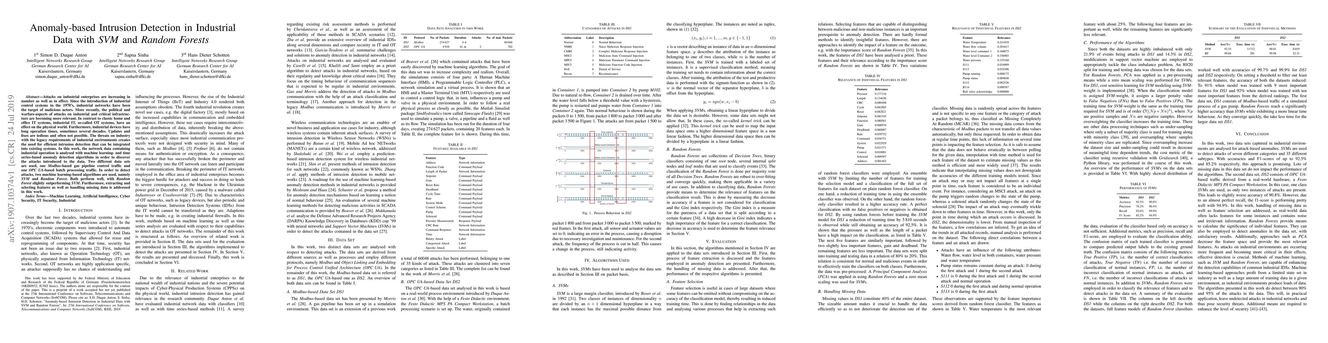 This paper proposes anomaly-based intrusion detection for industrial data using SVM and Random Forest algorithms. The study finds that Random Forest slightly outperforms SVM in detecting attacks on industrial control systems, highlighting the importance of feature extraction and handling missing data in the process.