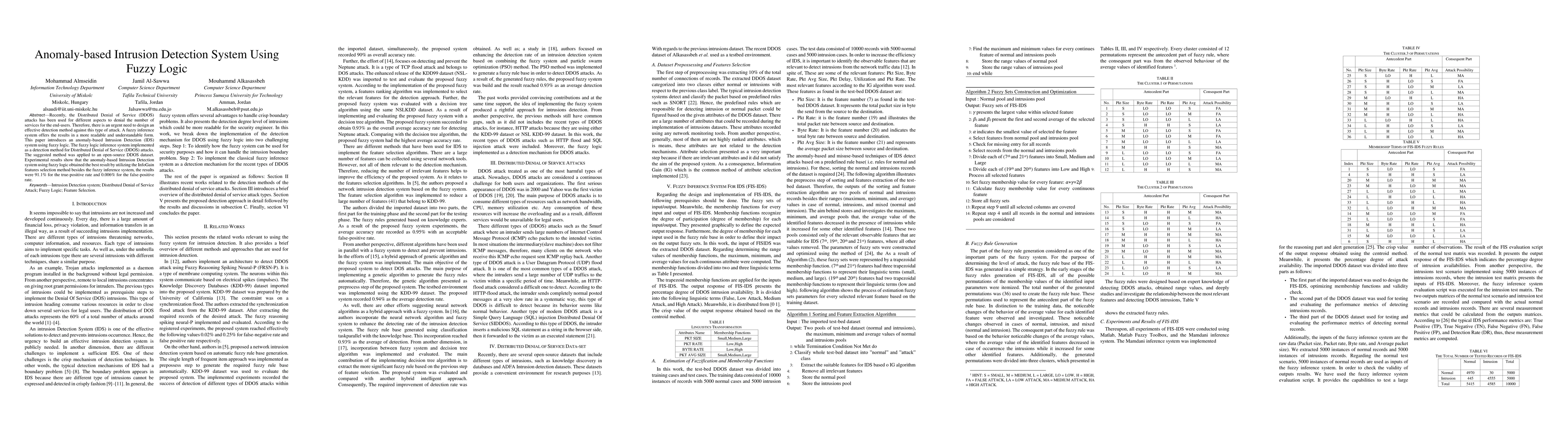 This paper proposes an anomaly-based Intrusion Detection System (IDS) using fuzzy logic to detect Distributed Denial of Service (DDOS) attacks. The method achieved a true-positive rate of 91.1% and a false-positive rate of 0.006% using InfoGain feature selection and fuzzy inference.