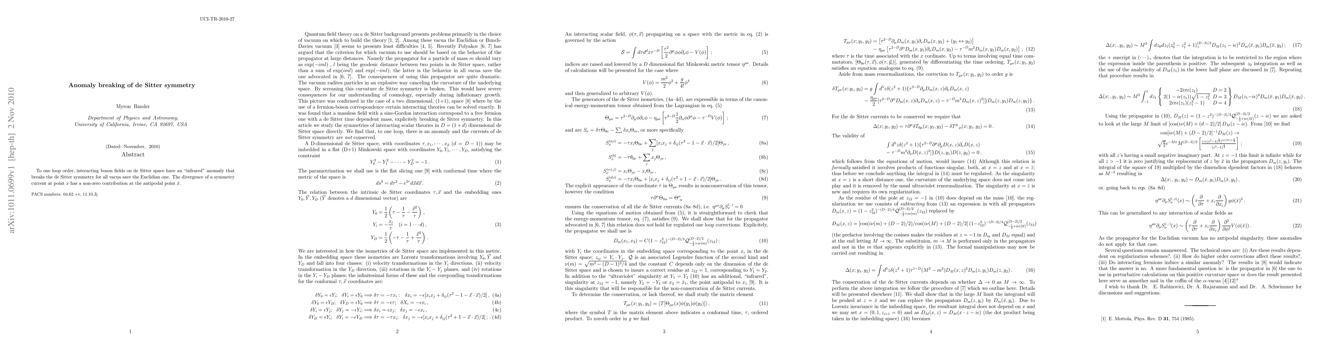 To one loop order, interacting boson fields on de Sitter space have an "infrared" anomaly that breaks the de Sitter symmetry for all vacua save the Euclidian one. The divergence of a symmetry current at point $x$ has a non-zero contribution at the antipodal point ${\bar x}$.