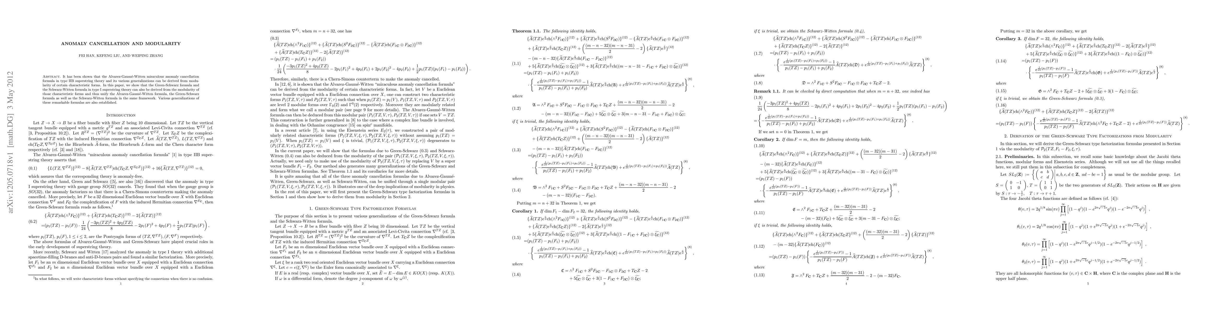 This paper demonstrates that the Green-Schwarz and Schwarz-Witten formulas in type I superstring theory can be derived from the modularity of characteristic forms, thereby unifying them with the Alvarez-Gaumé-Witten formula in type IIB superstring theory and establishing various generalizations.