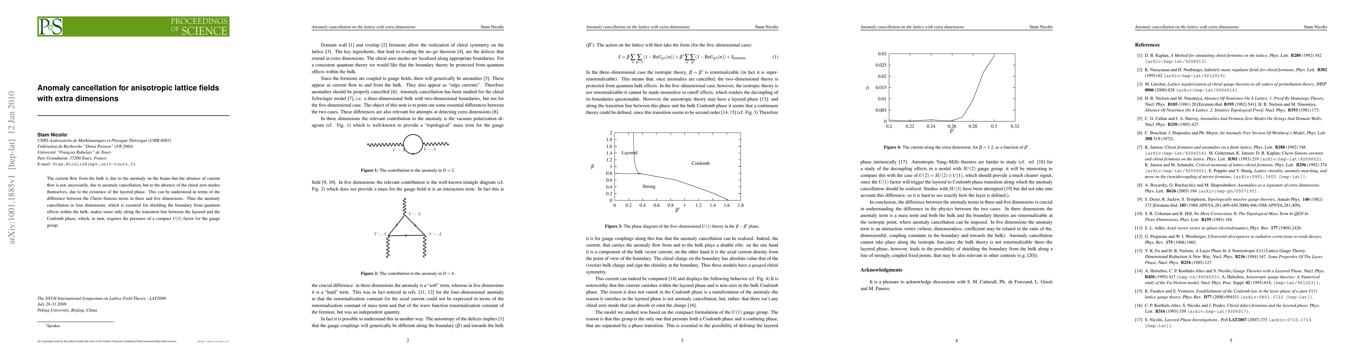 The paper discusses how anomaly cancellation in extra dimensions doesn't necessarily prevent current flow on a brane, but rather the absence of chiral zero modes due to the layered phase. Anomaly cancellation only works along the transition line between phases requiring a compact U(1) factor for the gauge group.