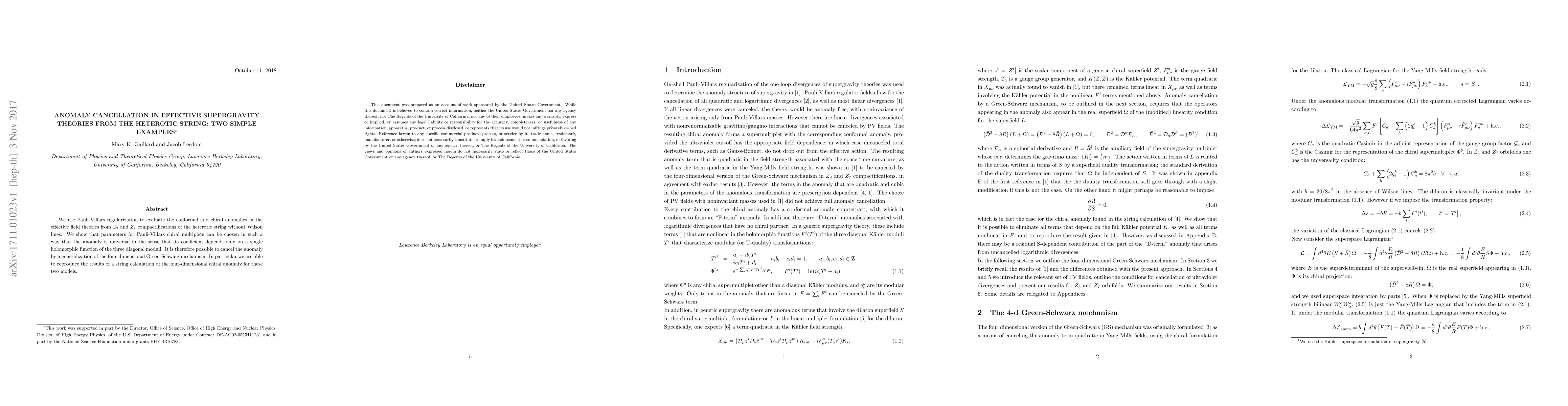 This paper evaluates conformal and chiral anomalies in effective supergravity theories derived from Z3 and Z7 heterotic string compactifications using Pauli-Villars regularization. It demonstrates that anomalies can be canceled through a generalized Green-Schwarz mechanism, showing consistency with string theory results.