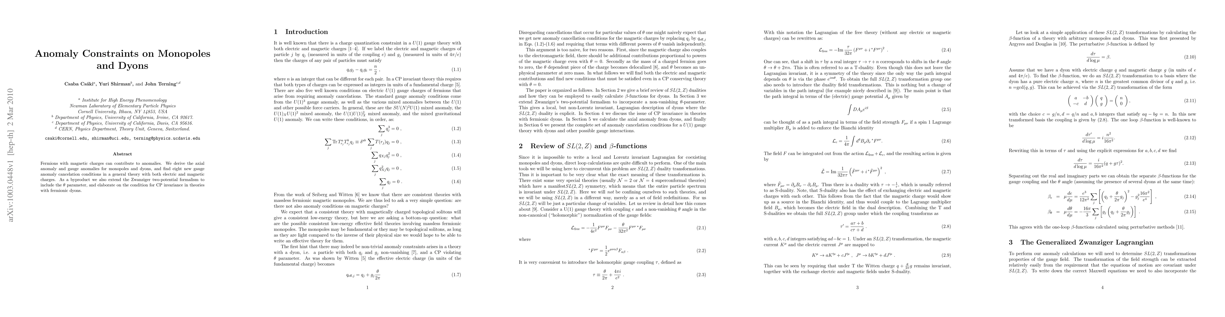 This paper derives axial and gauge anomalies for monopoles and dyons, uncovering eight new gauge anomaly cancellation conditions in theories with both electric and magnetic charges. It also extends the Zwanziger two-potential formalism to include the theta parameter and discusses CP invariance conditions for fermionic dyons.