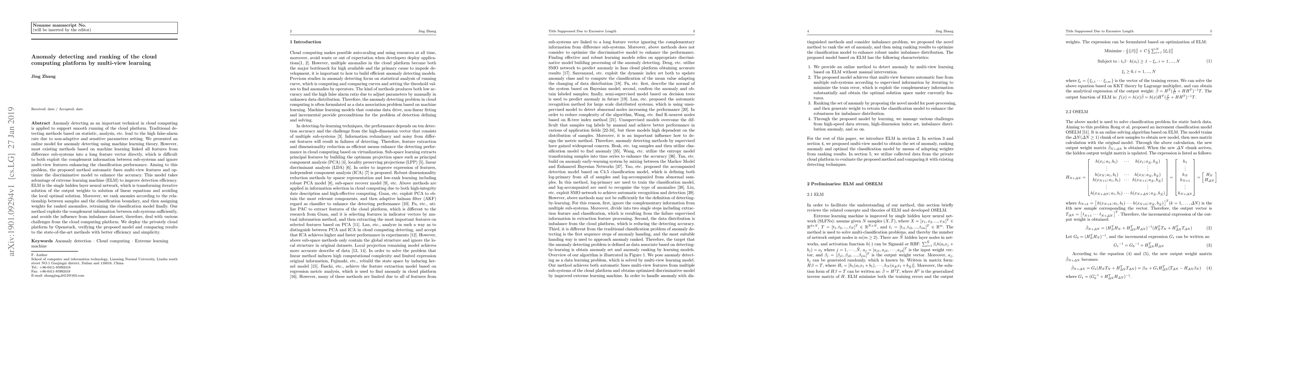 Anomaly detecting as an important technical in cloud computing is applied to support smooth running of the cloud platform. Traditional detecting methods based on statistic, analysis, etc. lead to the high false-alarm rate due to non-adaptive and sensitive parameters setting. We presented an online model for anomaly detecting using machine learning theory. However, most existing methods based on machine learning linked all features from difference sub-systems into a long feature vector directly, which is difficult to both exploit the complement information between sub-systems and ignore multi-view features enhancing the classification performance. Aiming to this problem, the proposed method automatic fuses multi-view features and optimize the discriminative model to enhance the accuracy. This model takes advantage of extreme learning machine (ELM) to improve detection efficiency. ELM is the single hidden layer neural network, which is transforming iterative solution the output weights to solution of linear equations and avoiding the local optimal solution. Moreover, we rank anomies according to the relationship between samples and the classification boundary, and then assigning weights for ranked anomalies, retraining the classification model finally. Our method exploits the complement information between sub-systems sufficiently, and avoids the influence from imbalance dataset, therefore, deal with various challenges from the cloud computing platform. We deploy the privately cloud platform by Openstack, verifying the proposed model and comparing results to the state-of-the-art methods with better efficiency and simplicity.