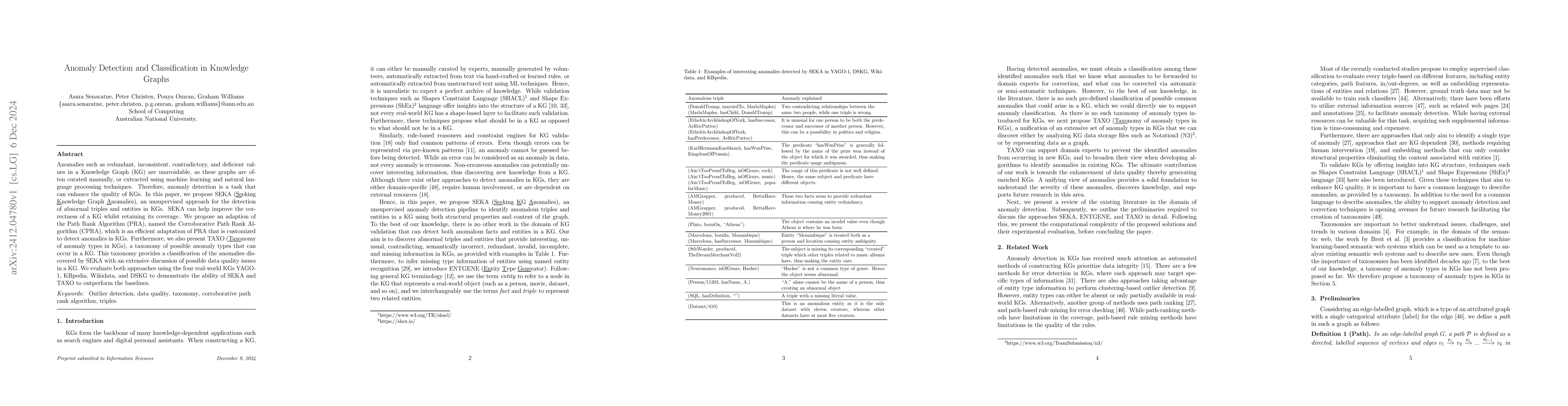 This paper introduces SEKA, an unsupervised method for detecting anomalies in Knowledge Graphs (KGs), and TAXO, a taxonomy categorizing these anomalies. SEKA employs the Corroborative Path Rank Algorithm to identify abnormal triples and entities, enhancing KG correctness while maintaining coverage. Both approaches are validated on four real-world KGs, outperforming existing baselines.