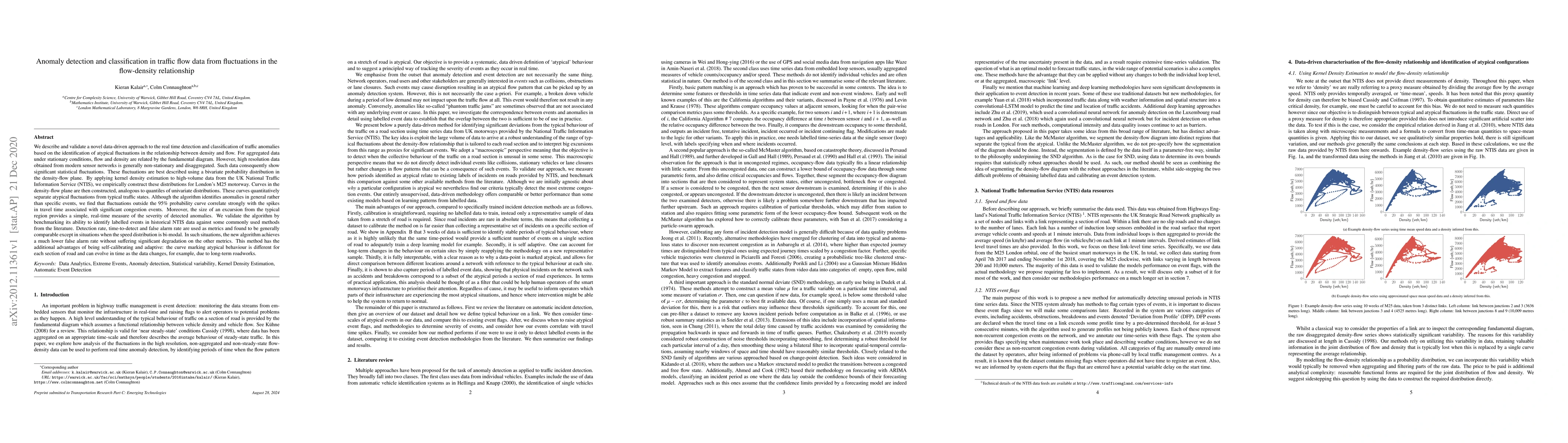We describe and validate a novel data-driven approach to the real time detection and classification of traffic anomalies based on the identification of atypical fluctuations in the relationship between density and flow. For aggregated data under stationary conditions, flow and density are related by the fundamental diagram. However, high resolution data obtained from modern sensor networks is generally non-stationary and disaggregated. Such data consequently show significant statistical fluctuations. These fluctuations are best described using a bivariate probability distribution in the density-flow plane. By applying kernel density estimation to high-volume data from the UK National Traffic Information Service (NTIS), we empirically construct these distributions for London's M25 motorway. Curves in the density-flow plane are then constructed, analogous to quantiles of univariate distributions. These curves quantitatively separate atypical fluctuations from typical traffic states. Although the algorithm identifies anomalies in general rather than specific events, we find that fluctuations outside the 95\% probability curve correlate strongly with the spikes in travel time associated with significant congestion events. Moreover, the size of an excursion from the typical region provides a simple, real-time measure of the severity of detected anomalies. We validate the algorithm by benchmarking its ability to identify labelled events in historical NTIS data against some commonly used methods from the literature. Detection rate, time-to-detect and false alarm rate are used as metrics and found to be generally comparable except in situations when the speed distribution is bi-modal. In such situations, the new algorithm achieves a much lower false alarm rate without suffering significant degradation on the other metrics. This method has the additional advantage of being self-calibrating.