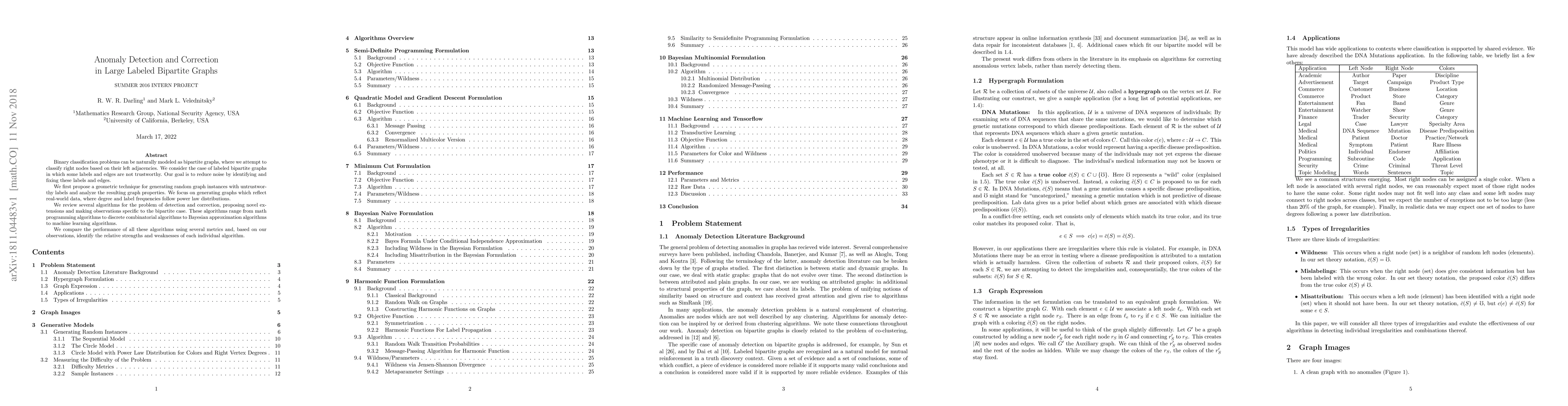 Binary classification problems can be naturally modeled as bipartite graphs, where we attempt to classify right nodes based on their left adjacencies. We consider the case of labeled bipartite graphs in which some labels and edges are not trustworthy. Our goal is to reduce noise by identifying and fixing these labels and edges. We first propose a geometric technique for generating random graph instances with untrustworthy labels and analyze the resulting graph properties. We focus on generating graphs which reflect real-world data, where degree and label frequencies follow power law distributions. We review several algorithms for the problem of detection and correction, proposing novel extensions and making observations specific to the bipartite case. These algorithms range from math programming algorithms to discrete combinatorial algorithms to Bayesian approximation algorithms to machine learning algorithms. We compare the performance of all these algorithms using several metrics and, based on our observations, identify the relative strengths and weaknesses of each individual algorithm.
