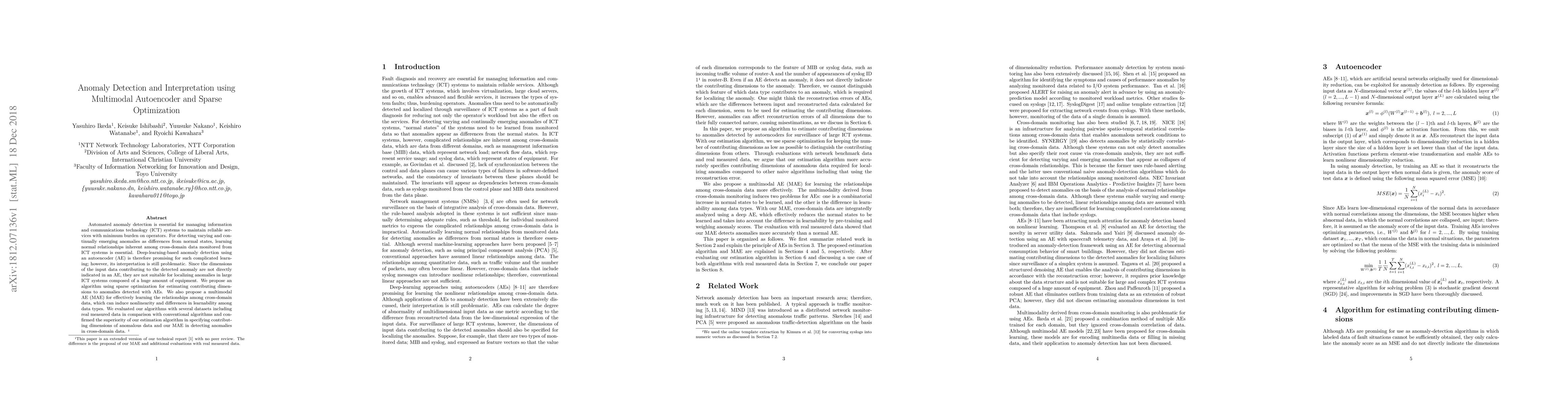Automated anomaly detection is essential for managing information and communications technology (ICT) systems to maintain reliable services with minimum burden on operators. For detecting varying and continually emerging anomalies as differences from normal states, learning normal relationships inherent among cross-domain data monitored from ICT systems is essential. Deep-learning-based anomaly detection using an autoencoder (AE) is therefore promising for such complicated learning; however, its interpretation is still problematic. Since the dimensions of the input data contributing to the detected anomaly are not directly indicated in an AE, they are not suitable for localizing anomalies in large ICT systems composed of a huge amount of equipment. We propose an algorithm using sparse optimization for estimating contributing dimensions to anomalies detected with AEs. We also propose a multimodal AE (MAE) for effectively learning the relationships among cross-domain data, which can induce nonlinearity and differences in learnability among data types. We evaluated our algorithms with several datasets including real measured data in comparison with conventional algorithms and confirmed the superiority of our estimation algorithm in specifying contributing dimensions of anomalous data and our MAE in detecting anomalies in cross-domain data.