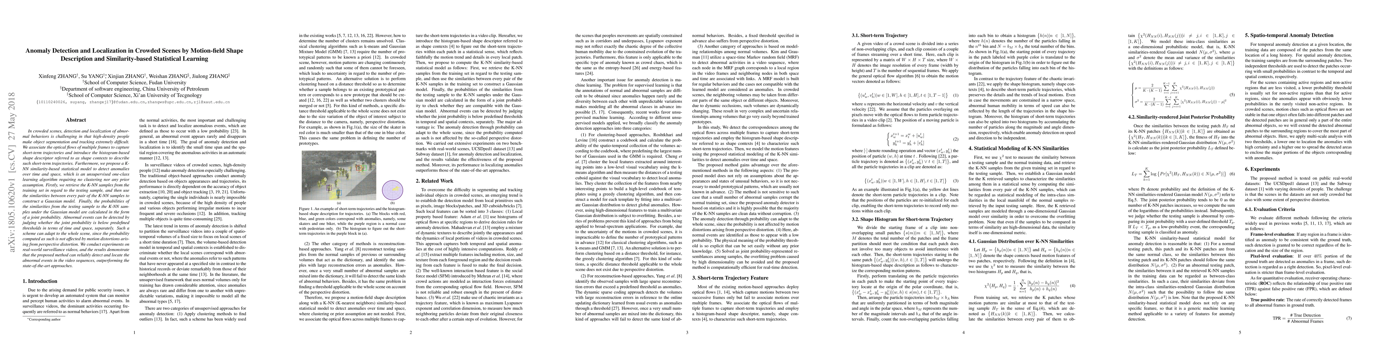In crowded scenes, detection and localization of abnormal behaviors is challenging in that high-density people make object segmentation and tracking extremely difficult. We associate the optical flows of multiple frames to capture short-term trajectories and introduce the histogram-based shape descriptor referred to as shape contexts to describe such short-term trajectories. Furthermore, we propose a K-NN similarity-based statistical model to detect anomalies over time and space, which is an unsupervised one-class learning algorithm requiring no clustering nor any prior assumption. Firstly, we retrieve the K-NN samples from the training set in regard to the testing sample, and then use the similarities between every pair of the K-NN samples to construct a Gaussian model. Finally, the probabilities of the similarities from the testing sample to the K-NN samples under the Gaussian model are calculated in the form of a joint probability. Abnormal events can be detected by judging whether the joint probability is below predefined thresholds in terms of time and space, separately. Such a scheme can adapt to the whole scene, since the probability computed as such is not affected by motion distortions arising from perspective distortion. We conduct experiments on real-world surveillance videos, and the results demonstrate that the proposed method can reliably detect and locate the abnormal events in the video sequences, outperforming the state-of-the-art approaches.